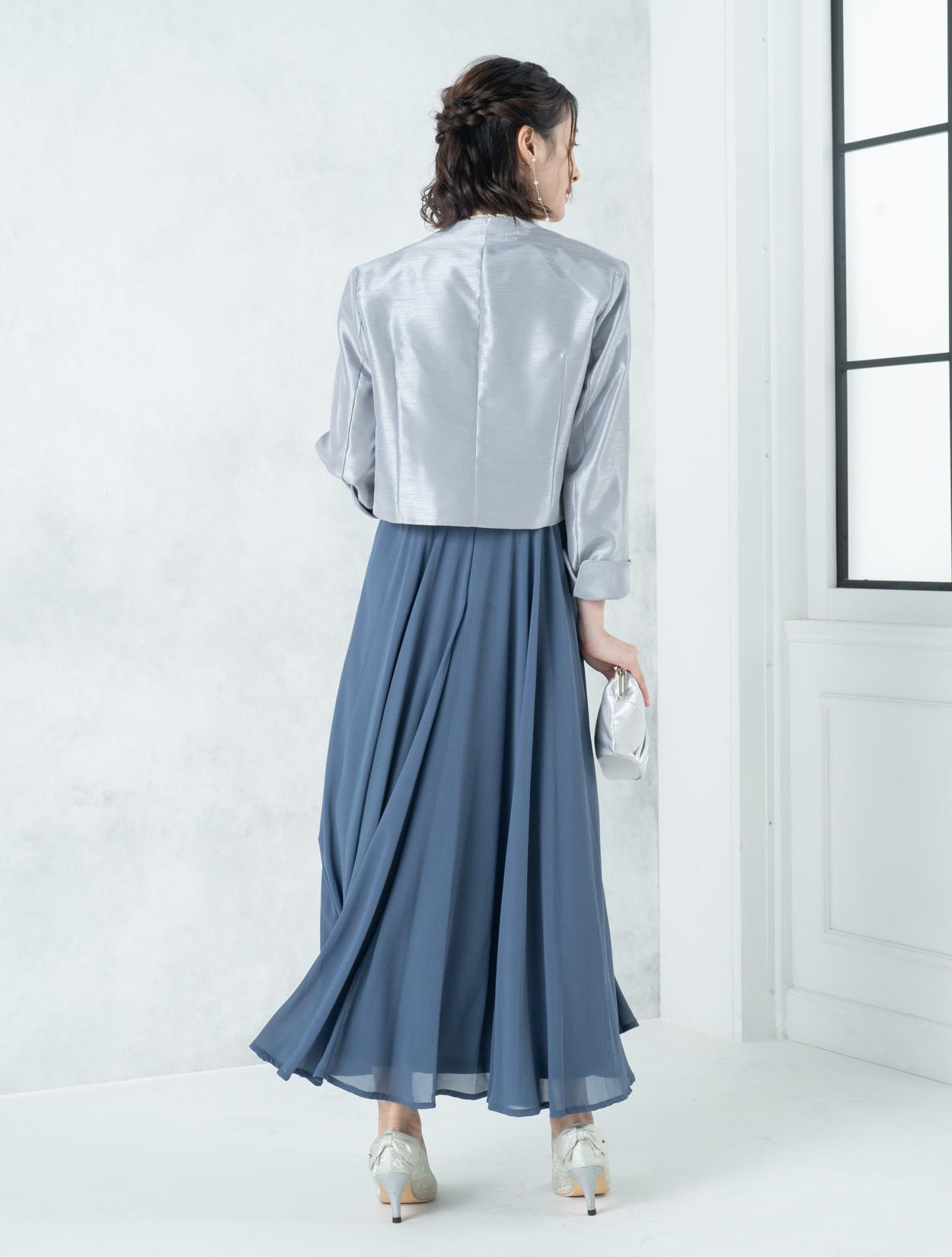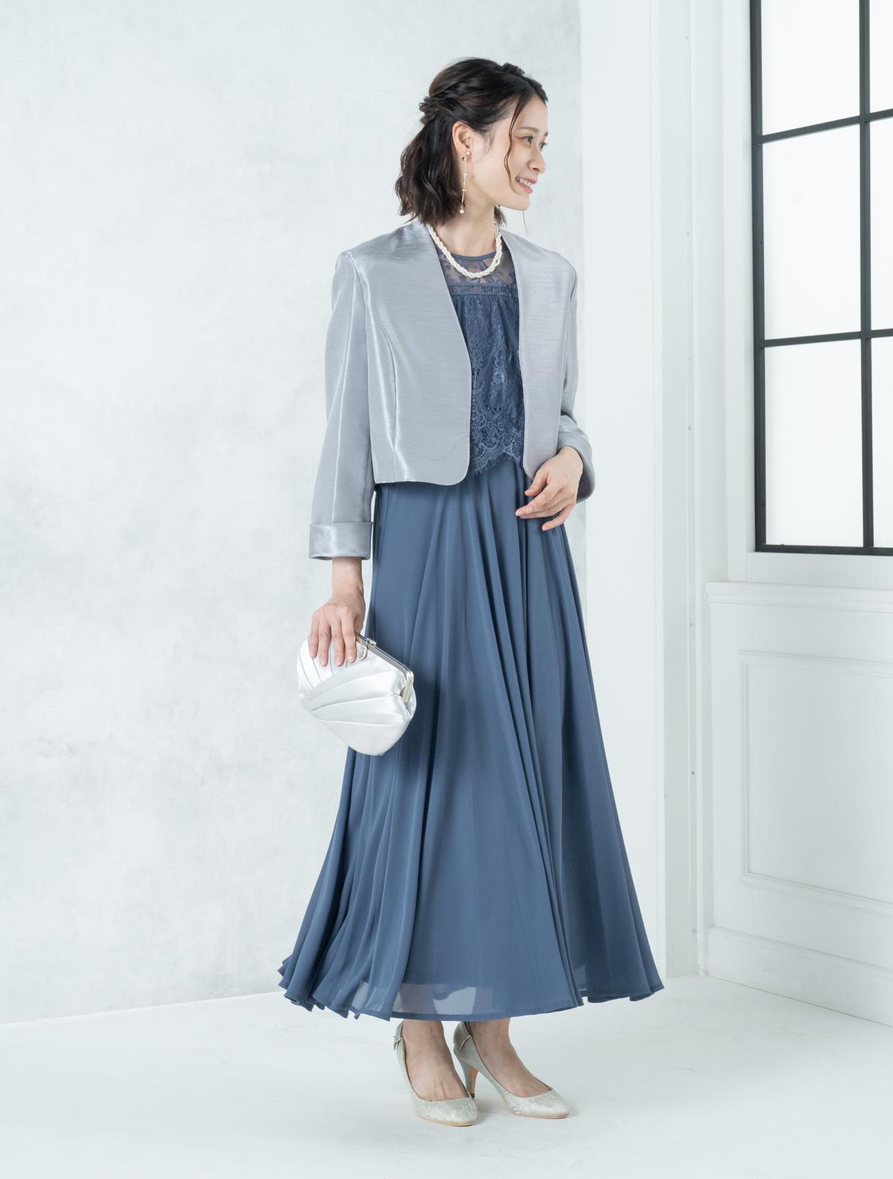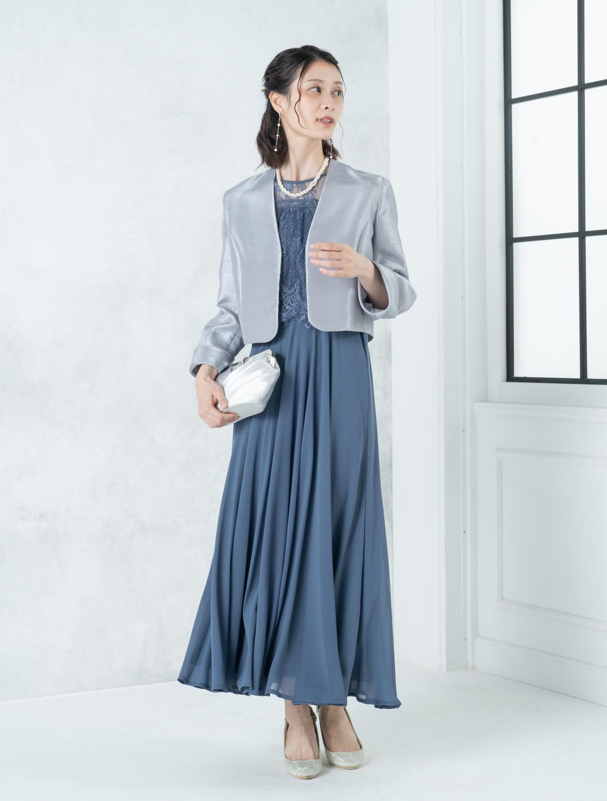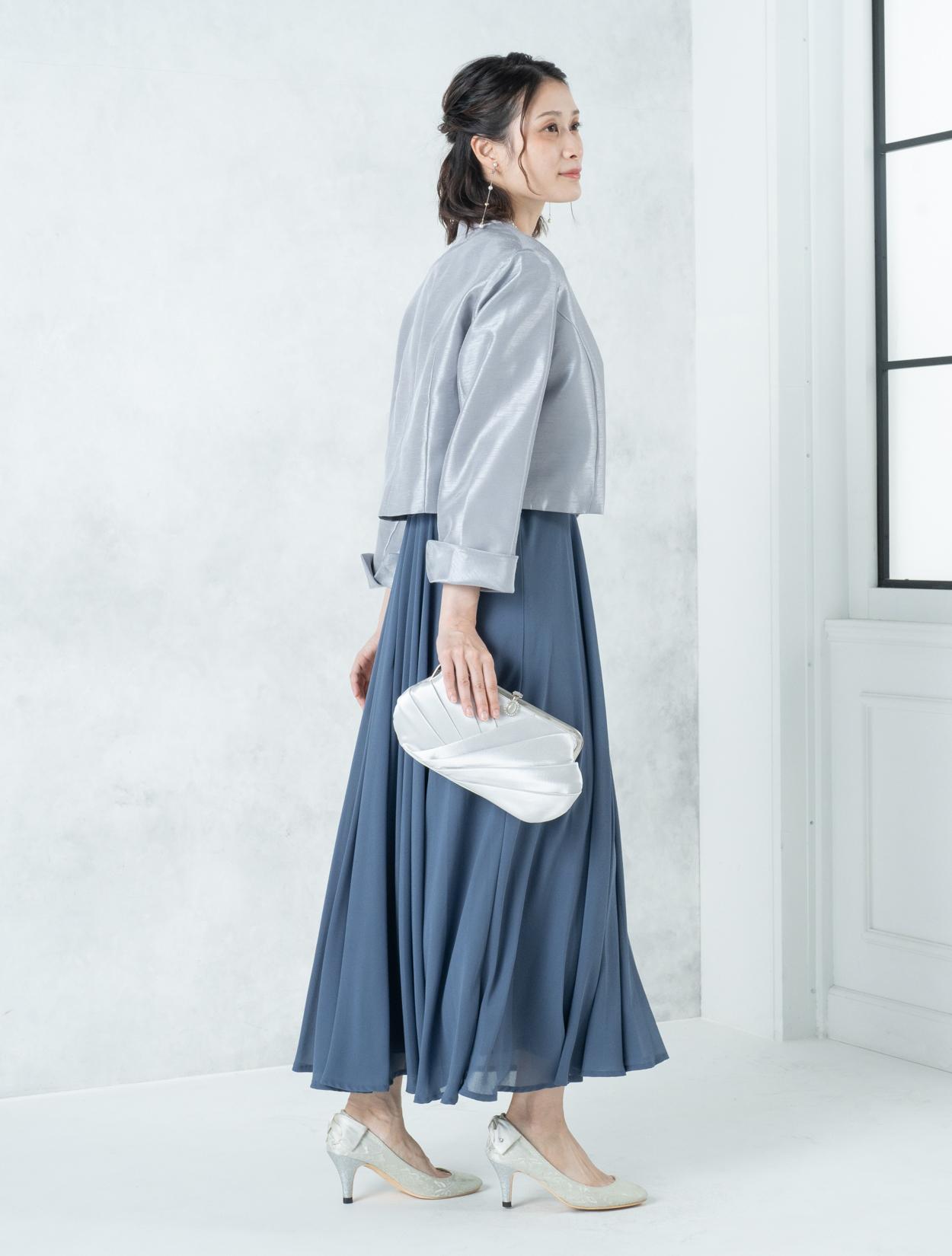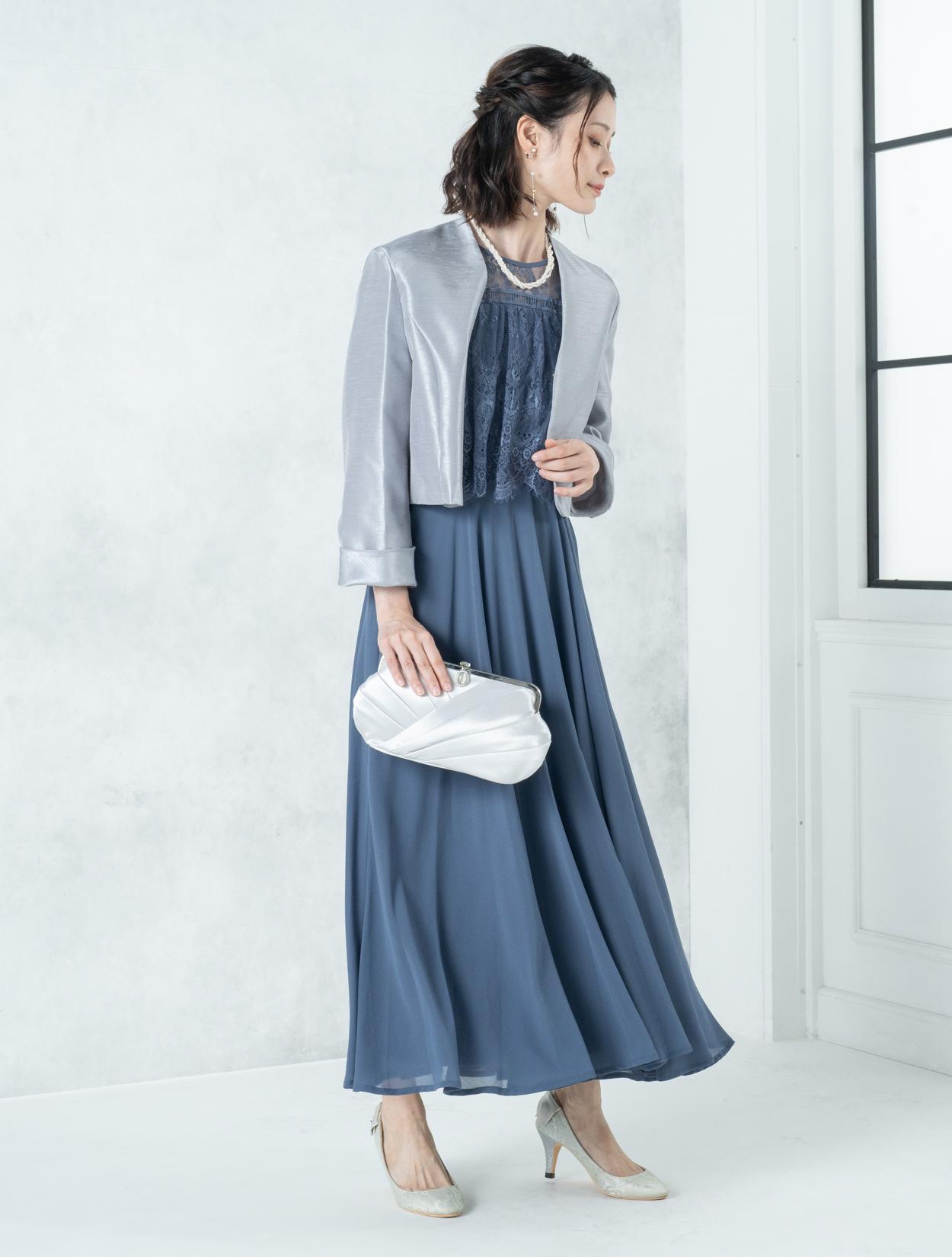■ブルーのドレスにグレーの羽織とシルバーのバックを合わせたワントーンコーディネート。