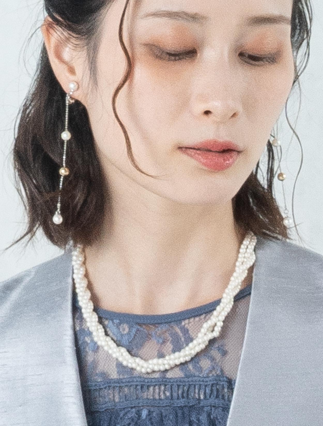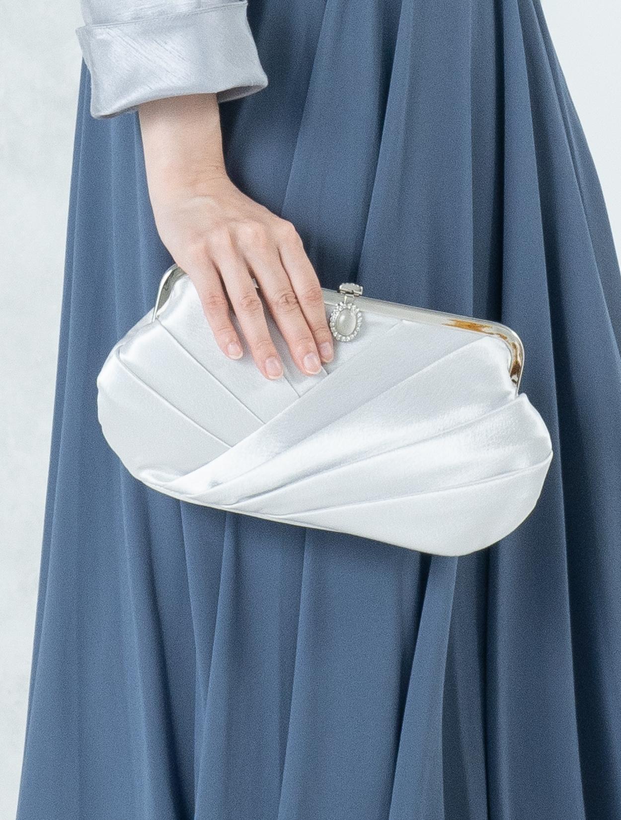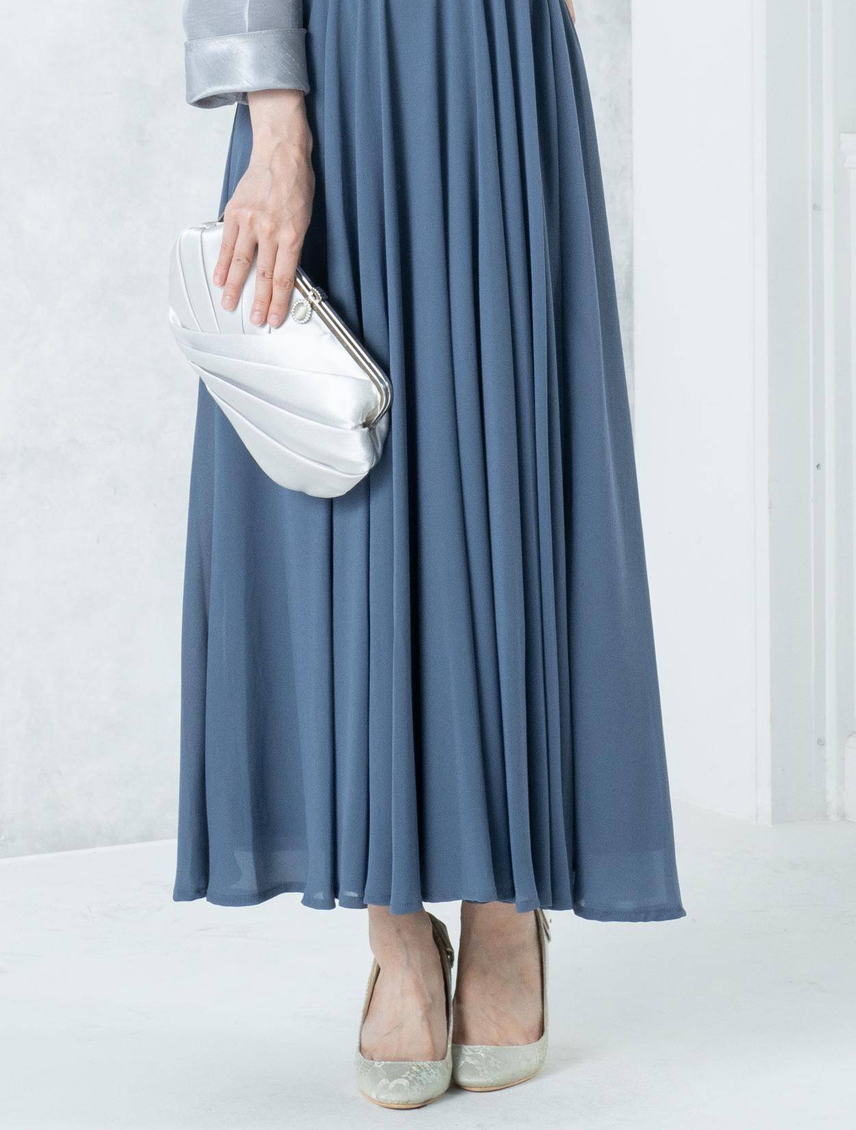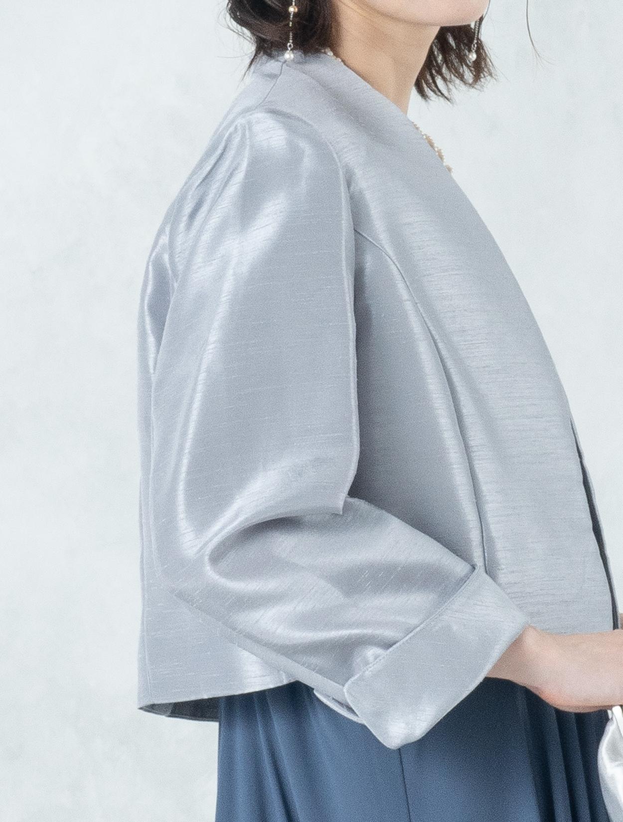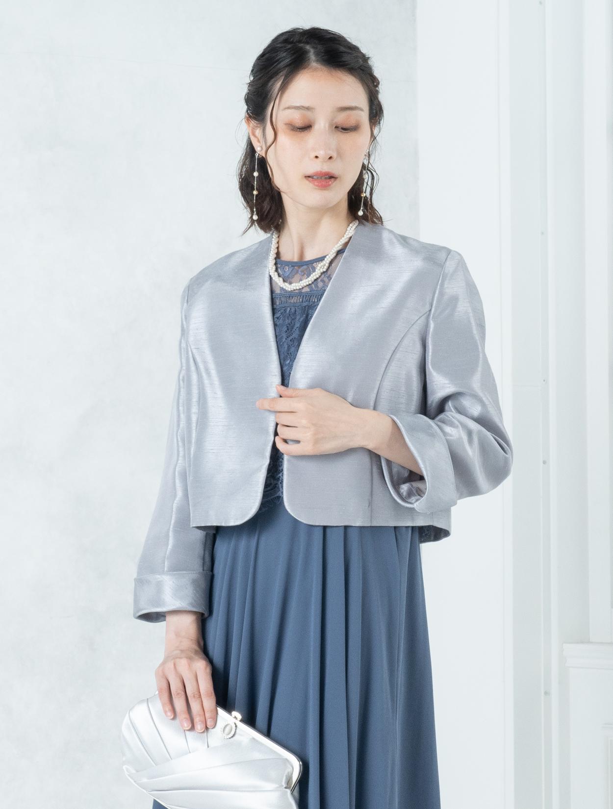 ■ブルーのドレスにグレーの羽織とシルバーのバックを合わせたワントーンコーディネート。