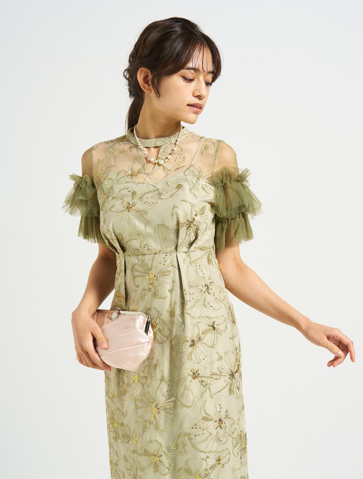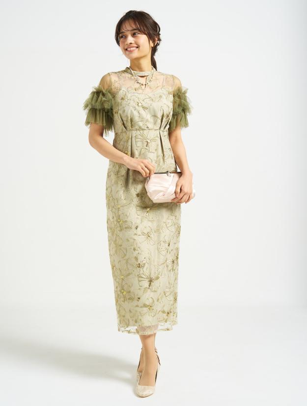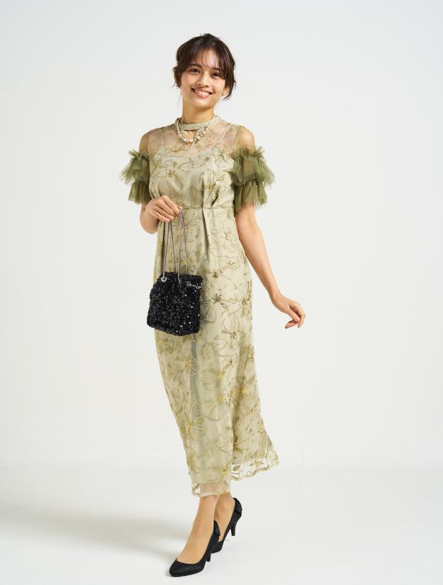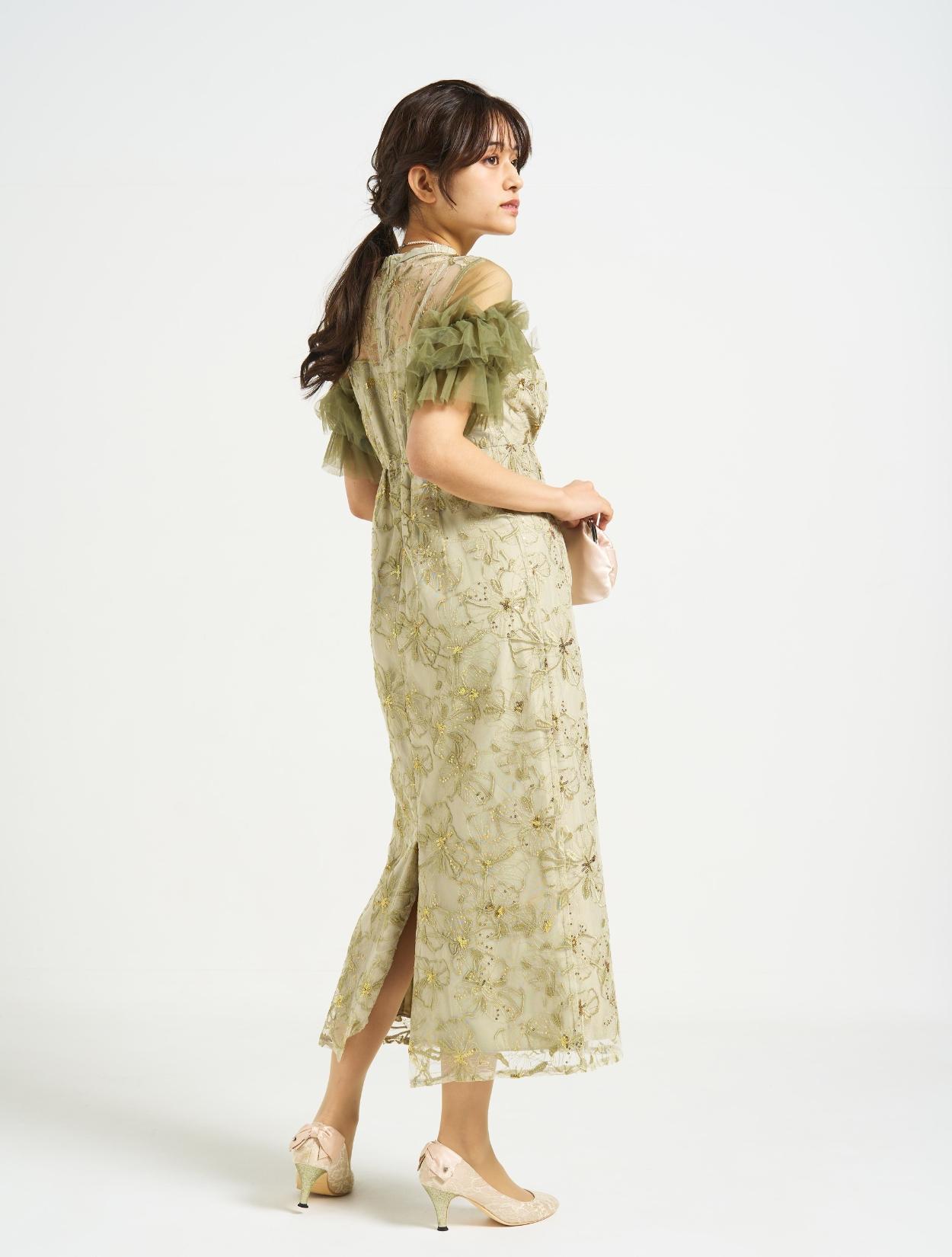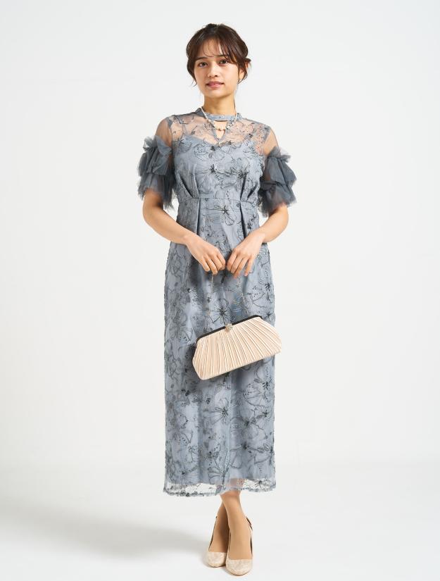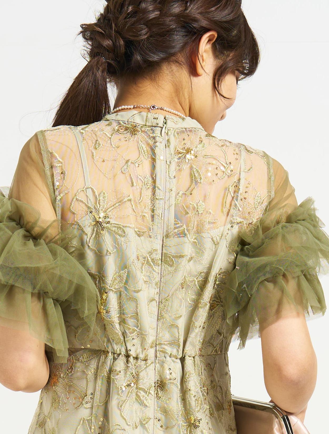 ■スパンコール刺繡と袖のボリュームチュールが目を引くドレス。