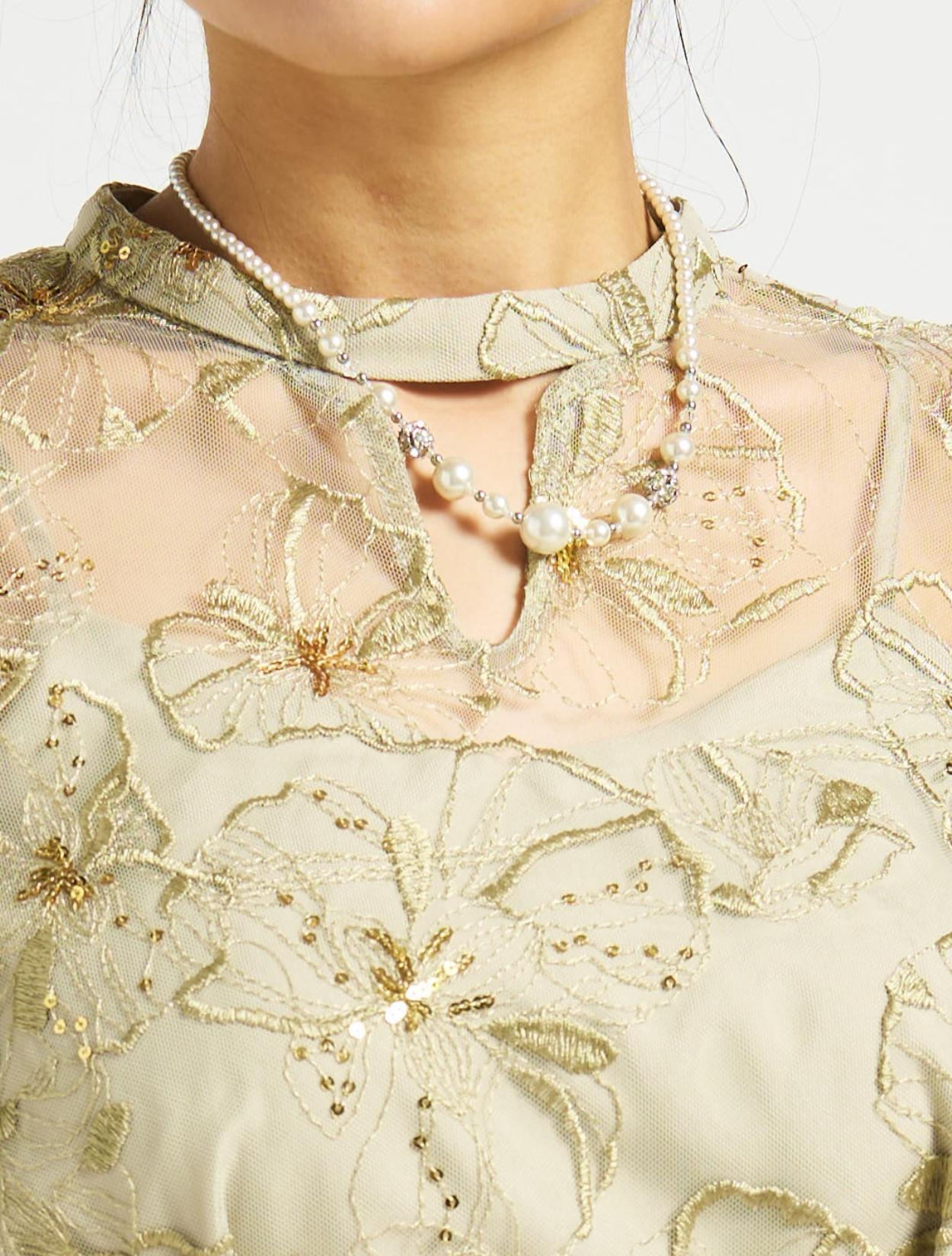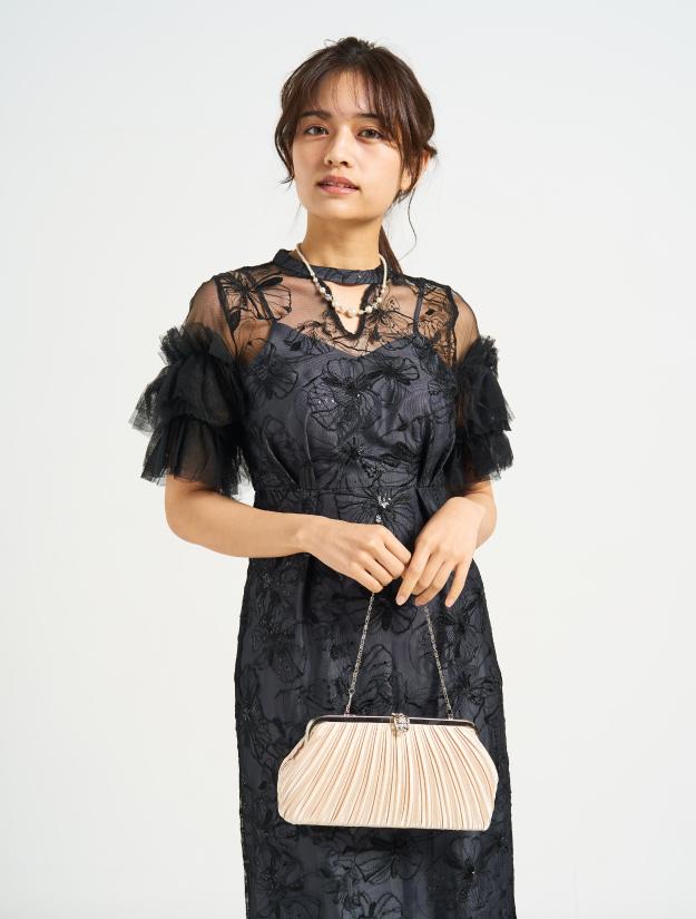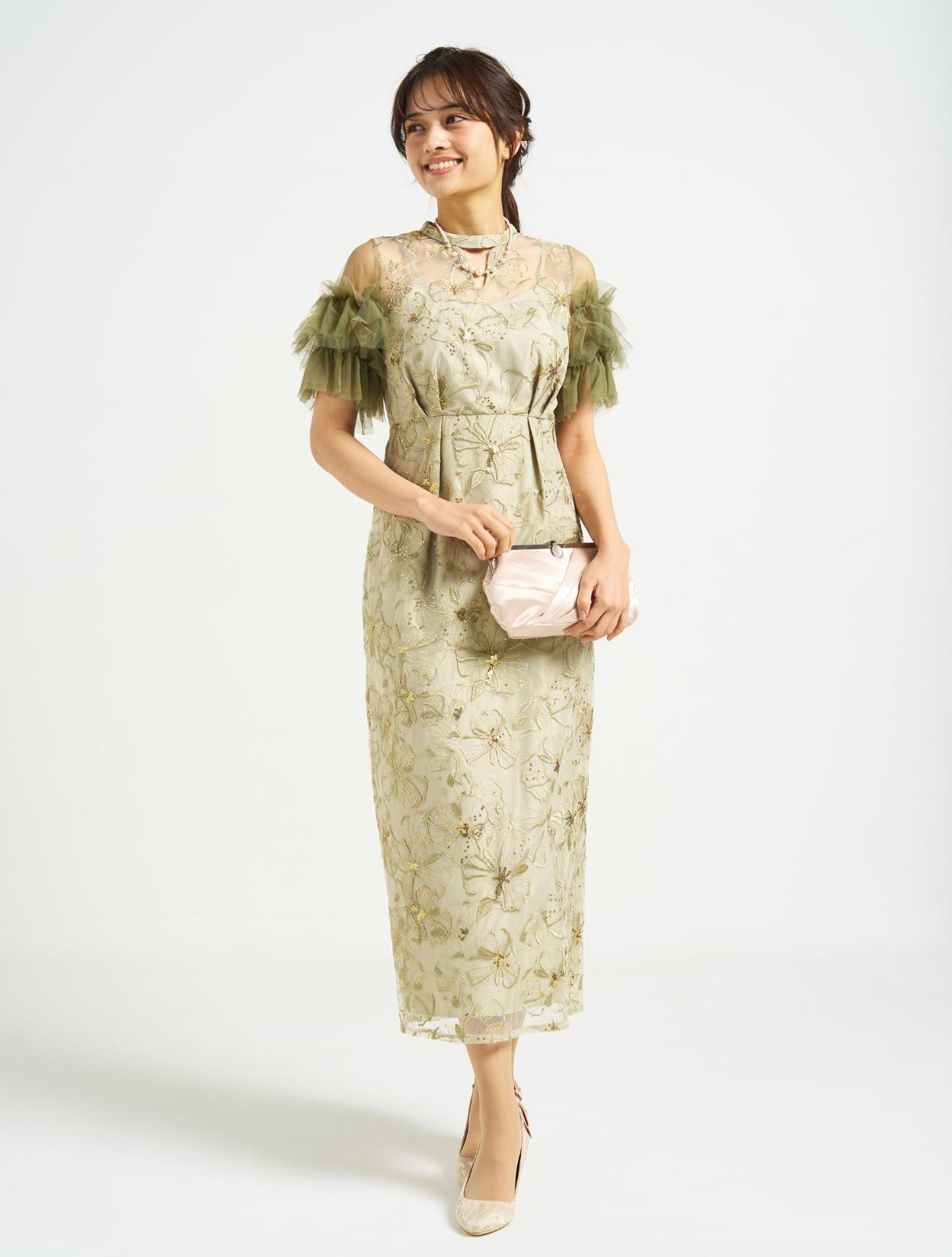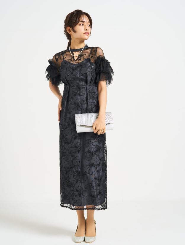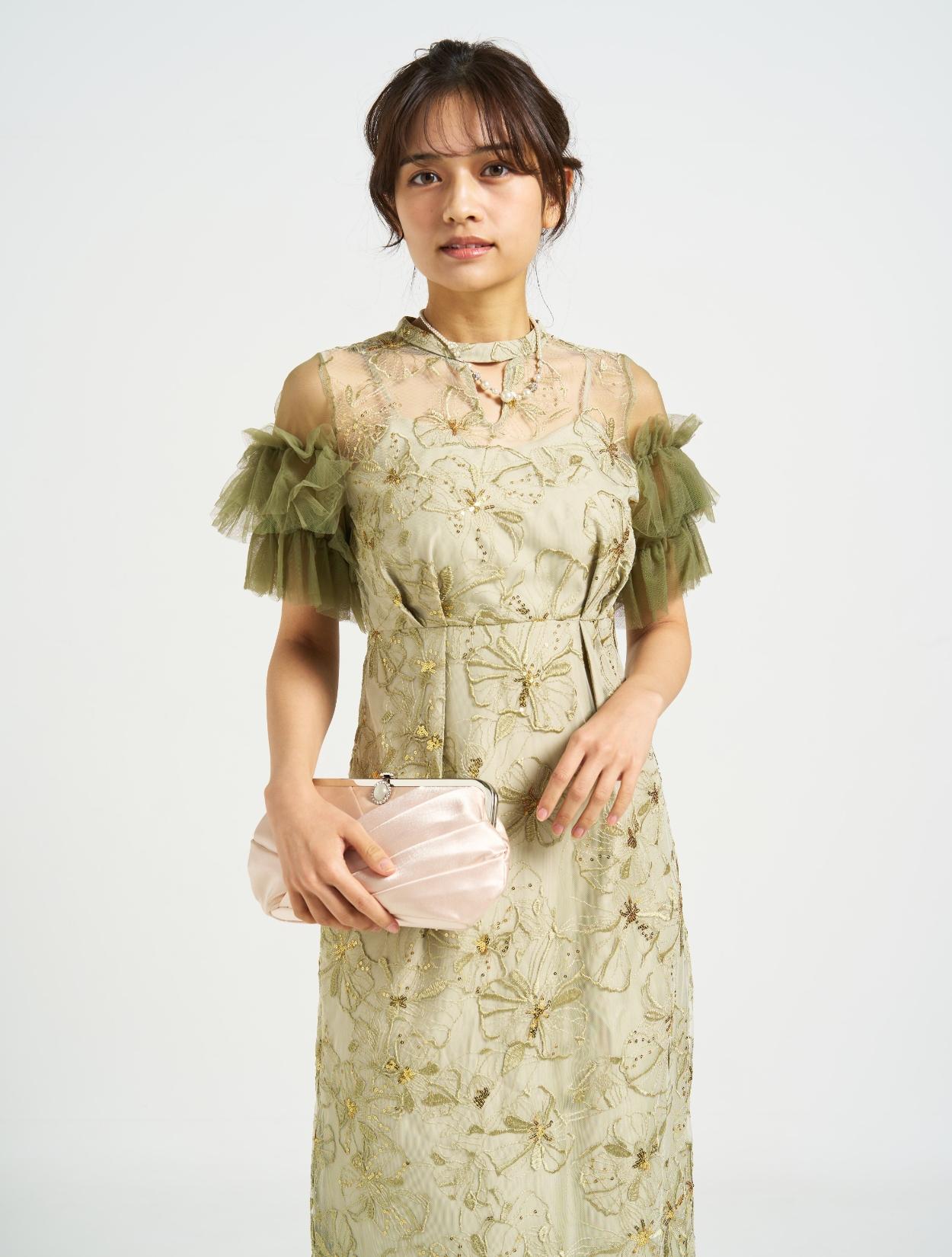 ■スパンコール刺繡と袖のボリュームチュールが目を引くドレス。
