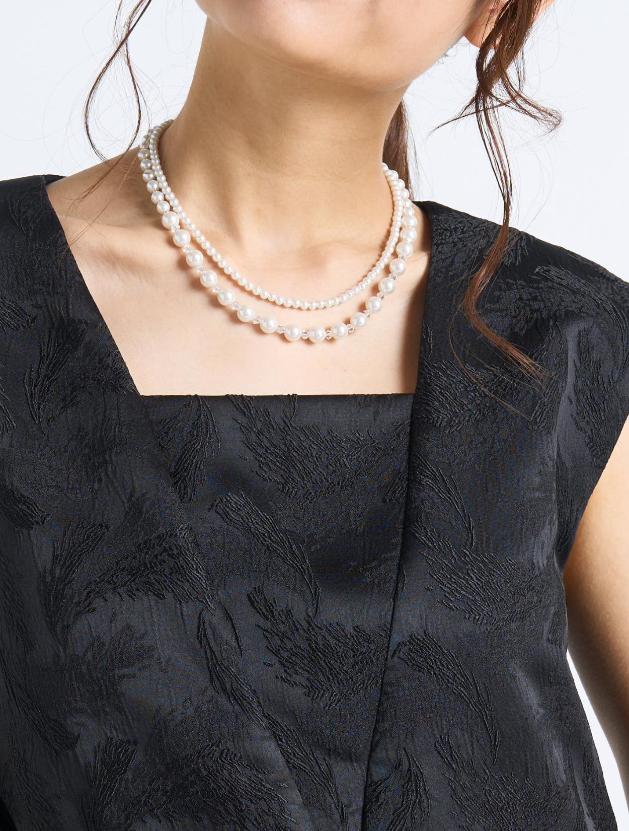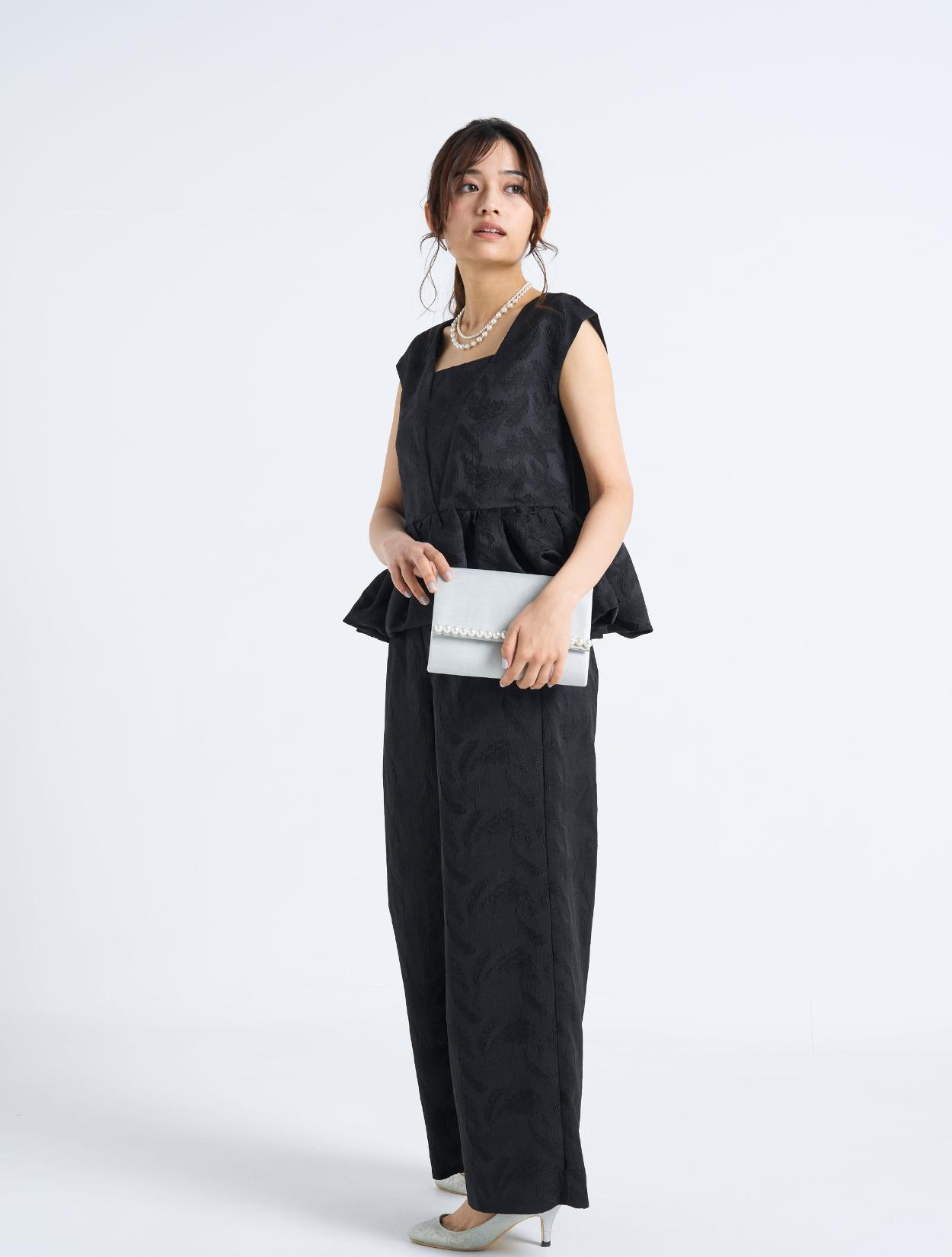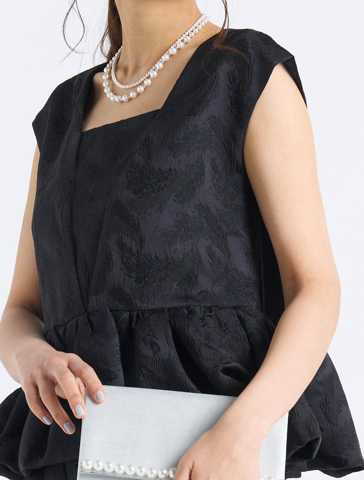 ■ブラックのドレスにネックレスとバッグのパールがよく映える洗練された雰囲気のコーディネート。
