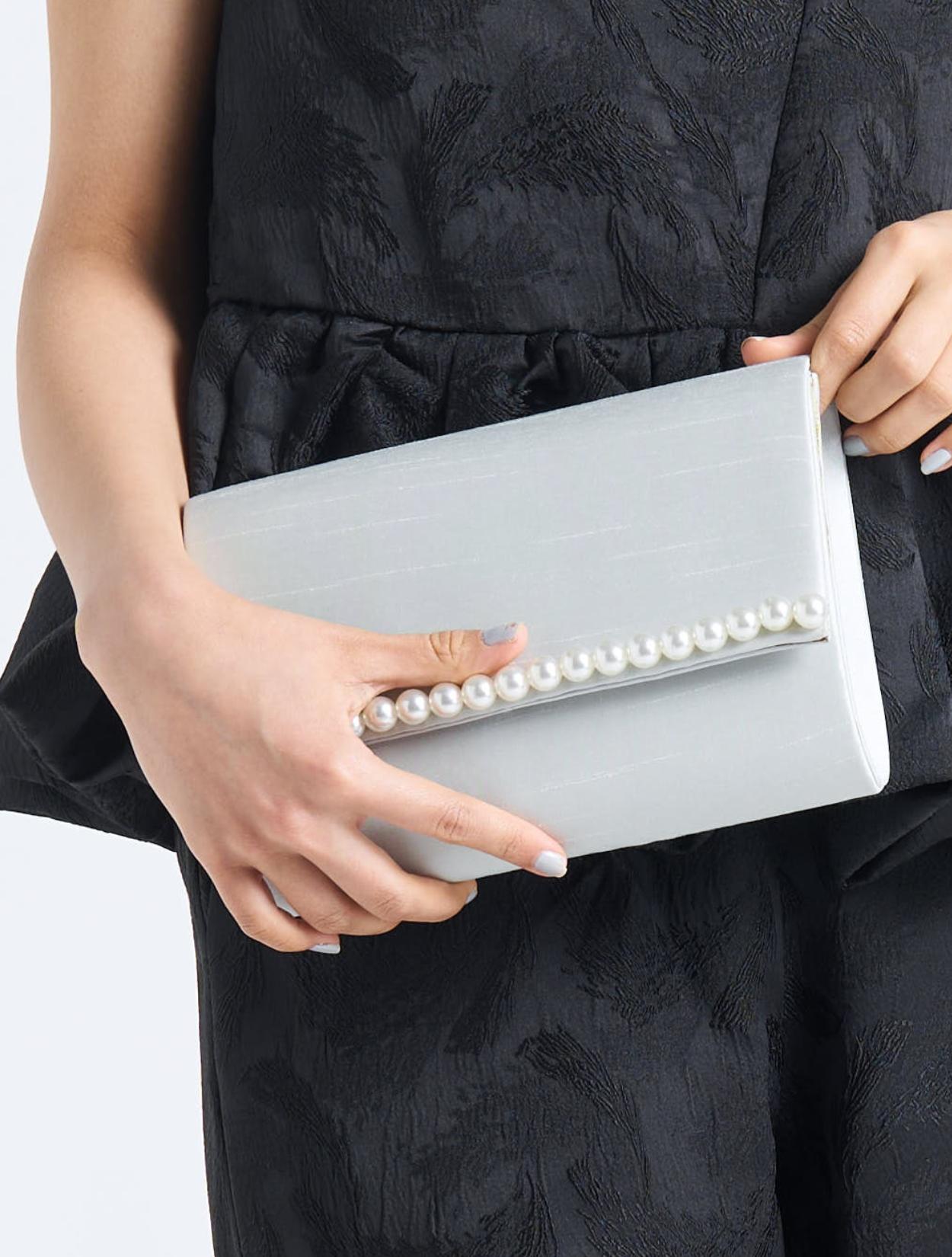 ■パールを基調とした爽やかなライトグレーのバッグで上品さをプラス。