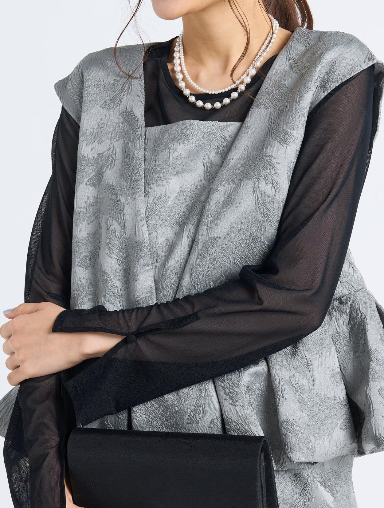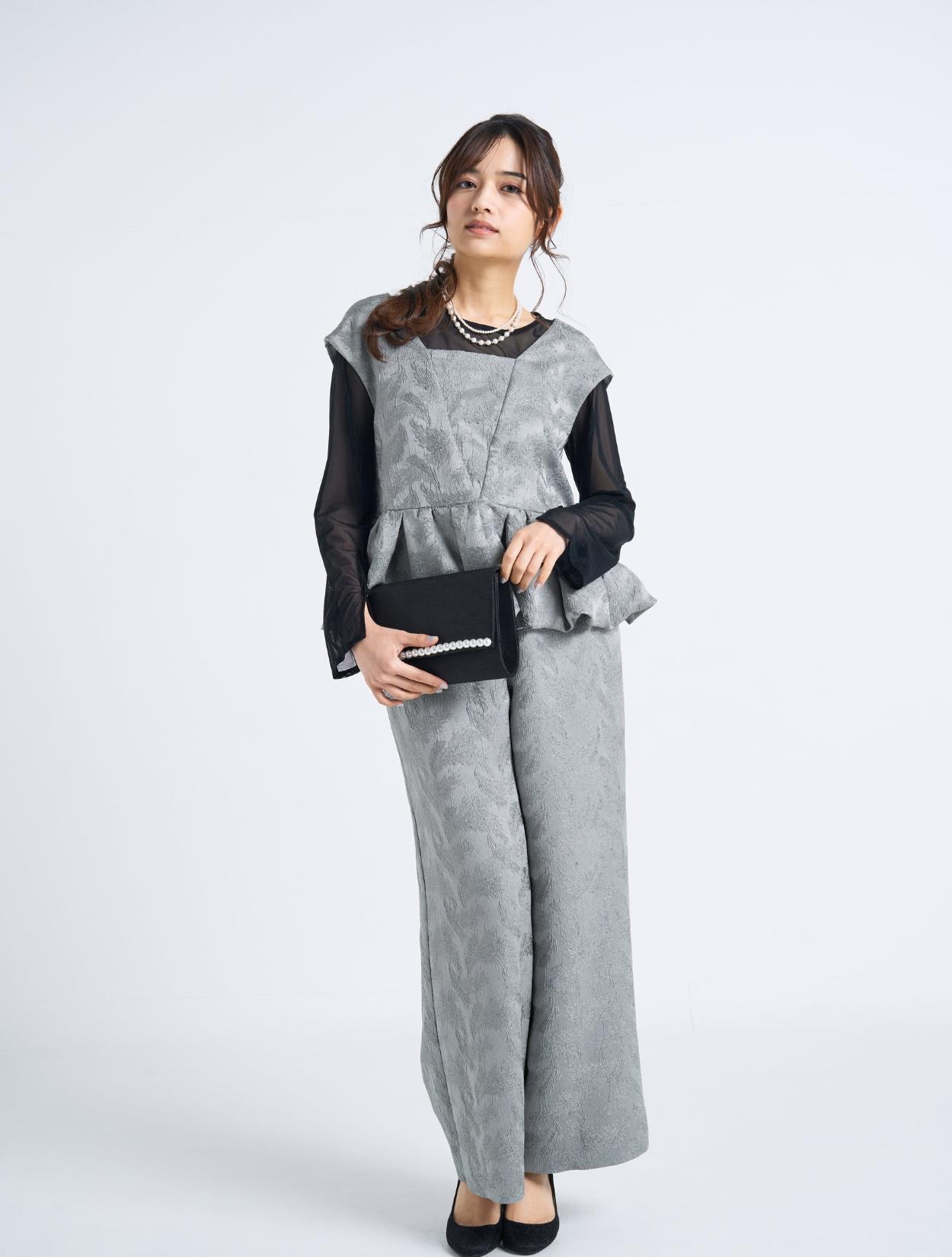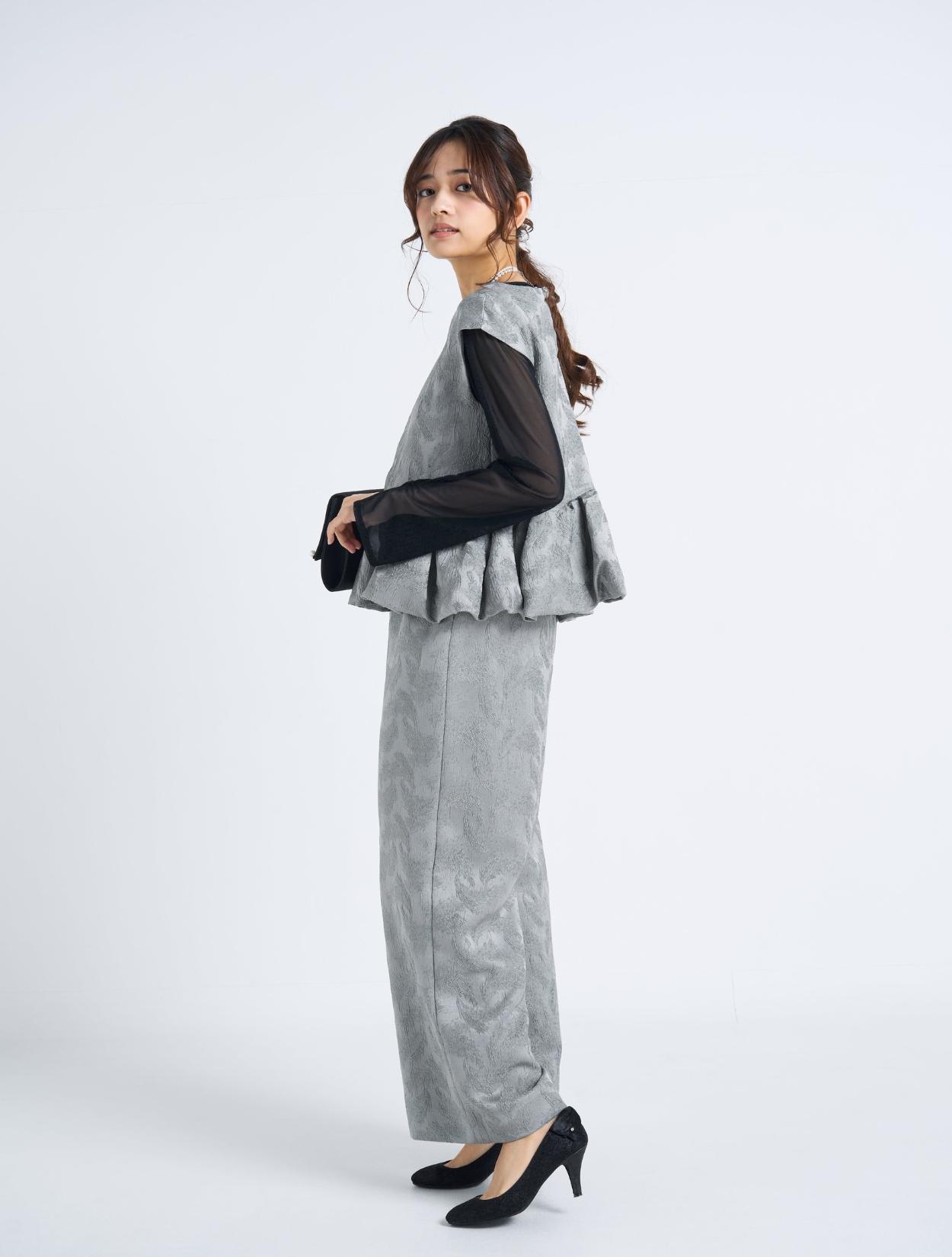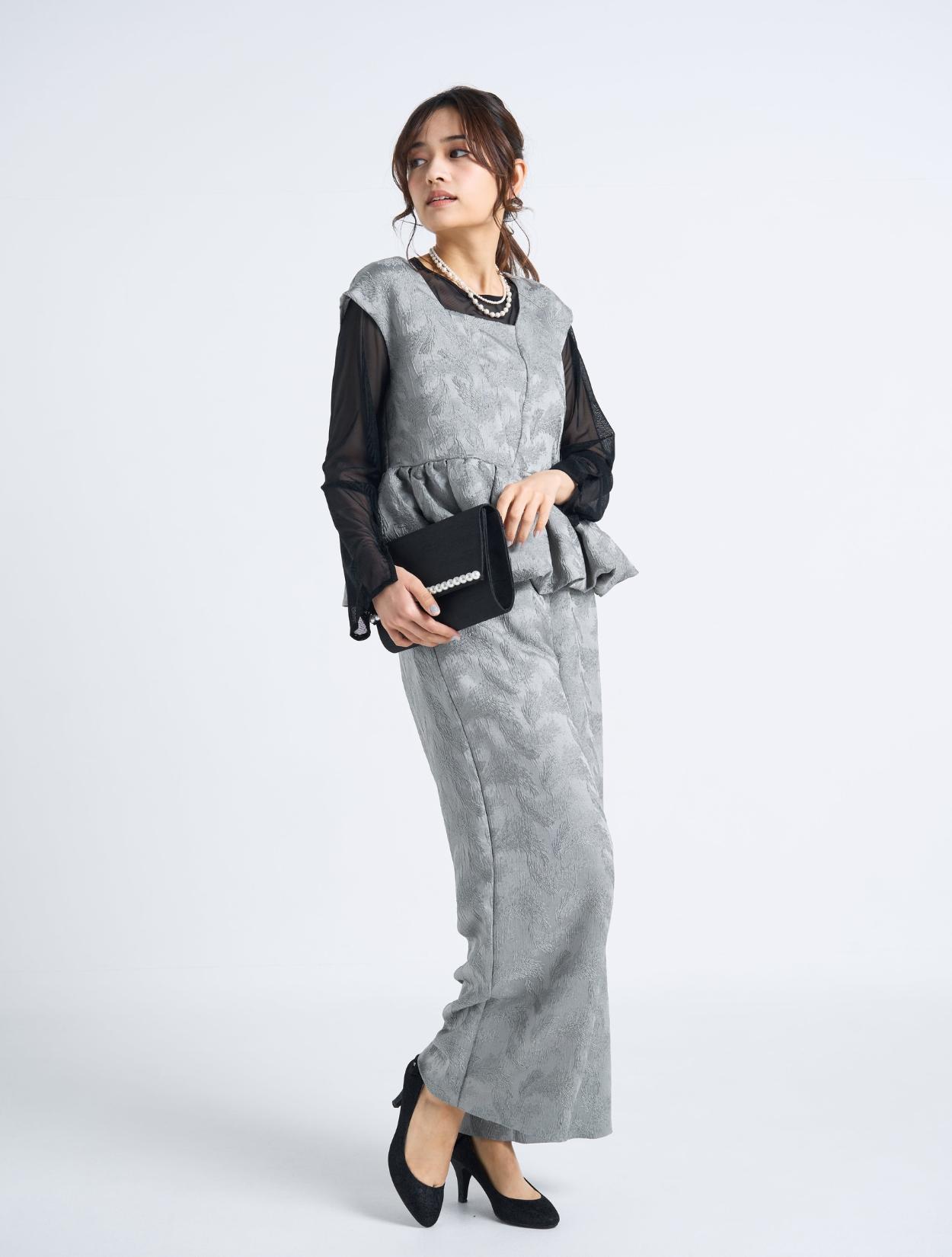 ■光沢感のあるグレーのドレスにブラックのシアーブラウスを合わせたスタイリッシュなコーディネート。