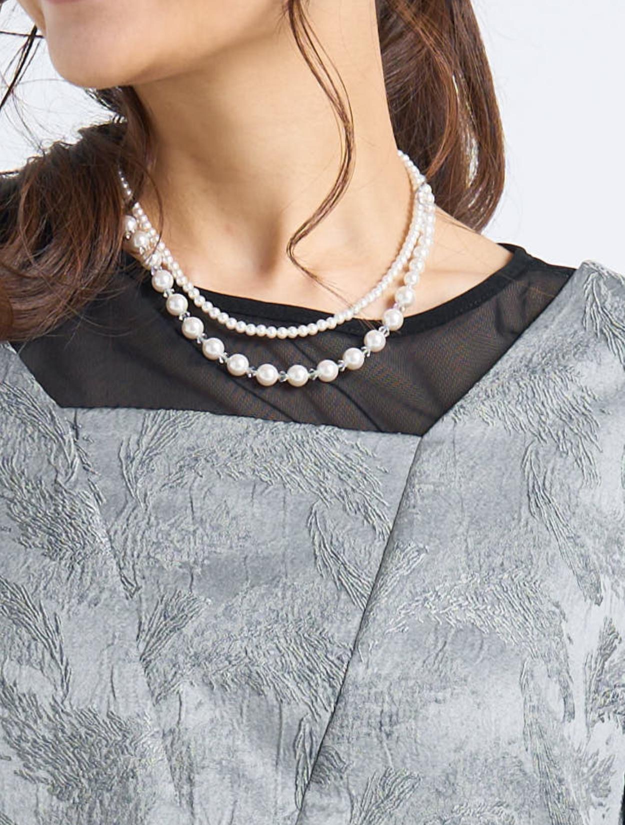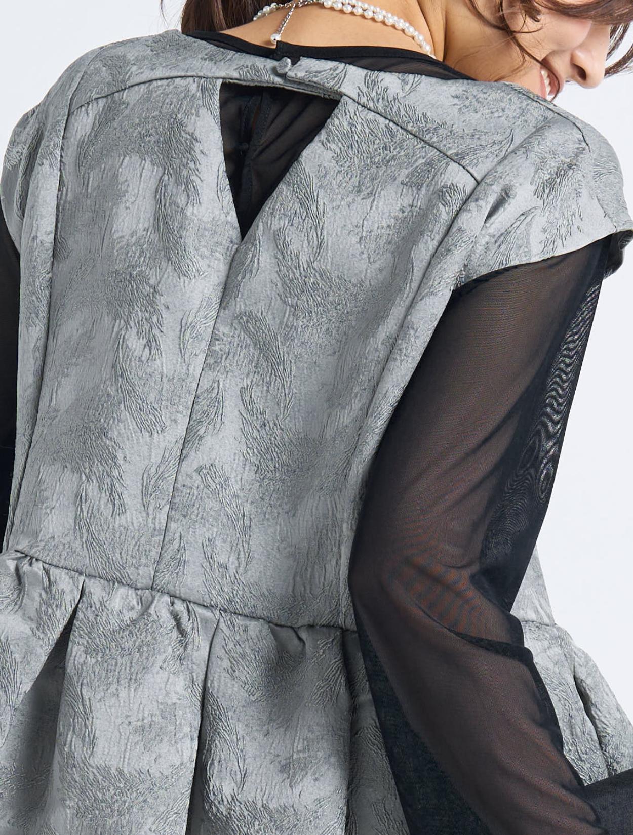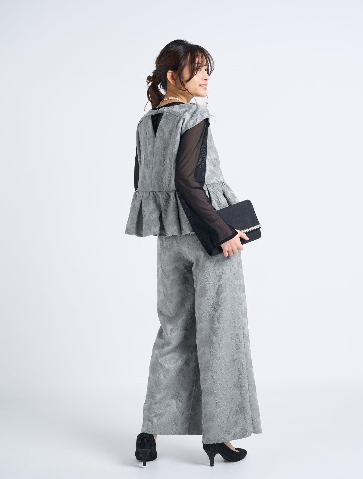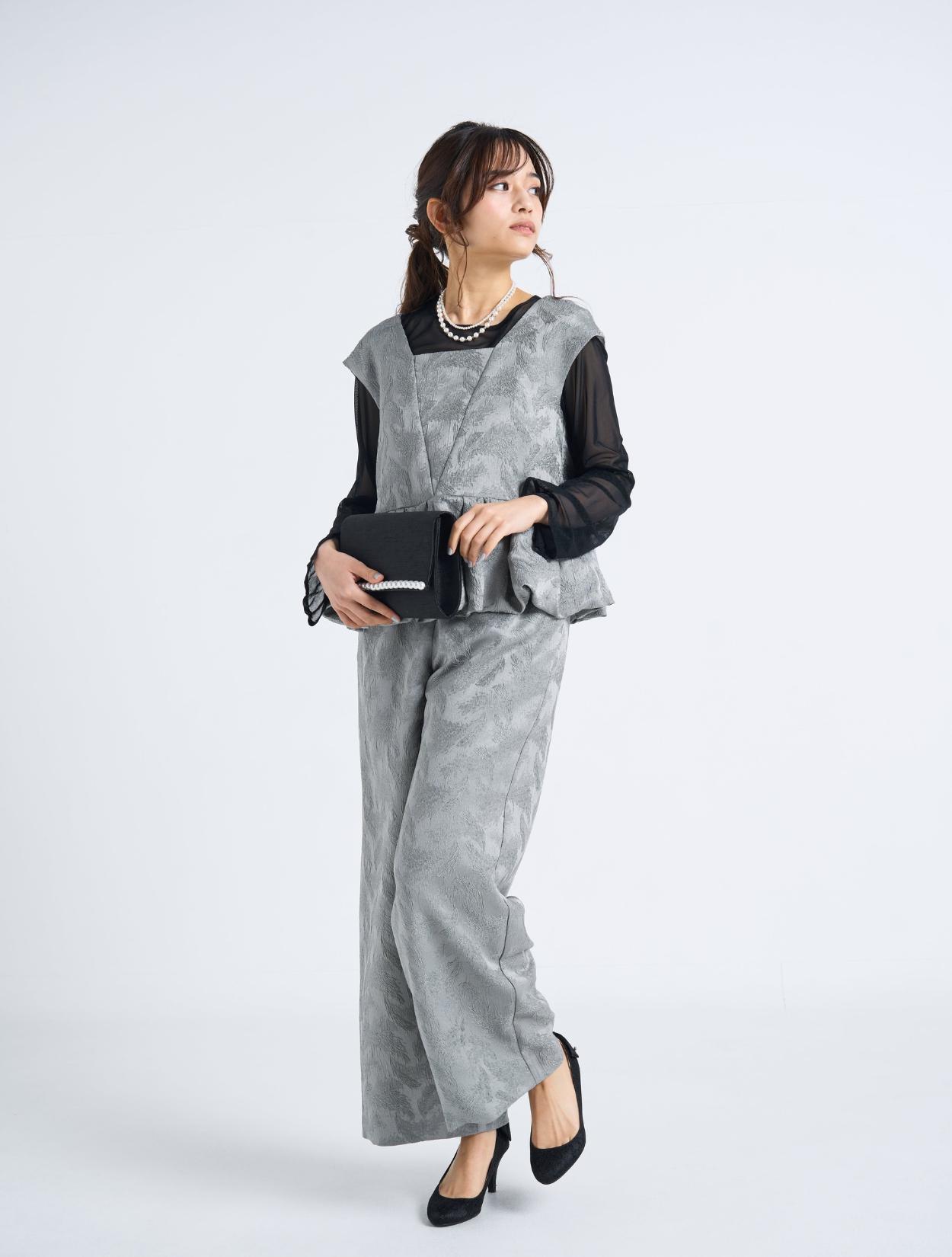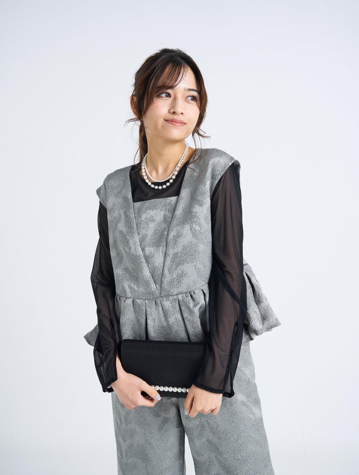 ■光沢感のあるグレーのドレスにブラックのシアーブラウスを合わせたスタイリッシュなコーディネート。