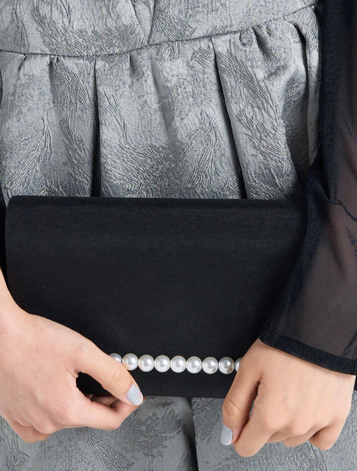 ■パールを基調としたブラックのバッグで締まった印象に。