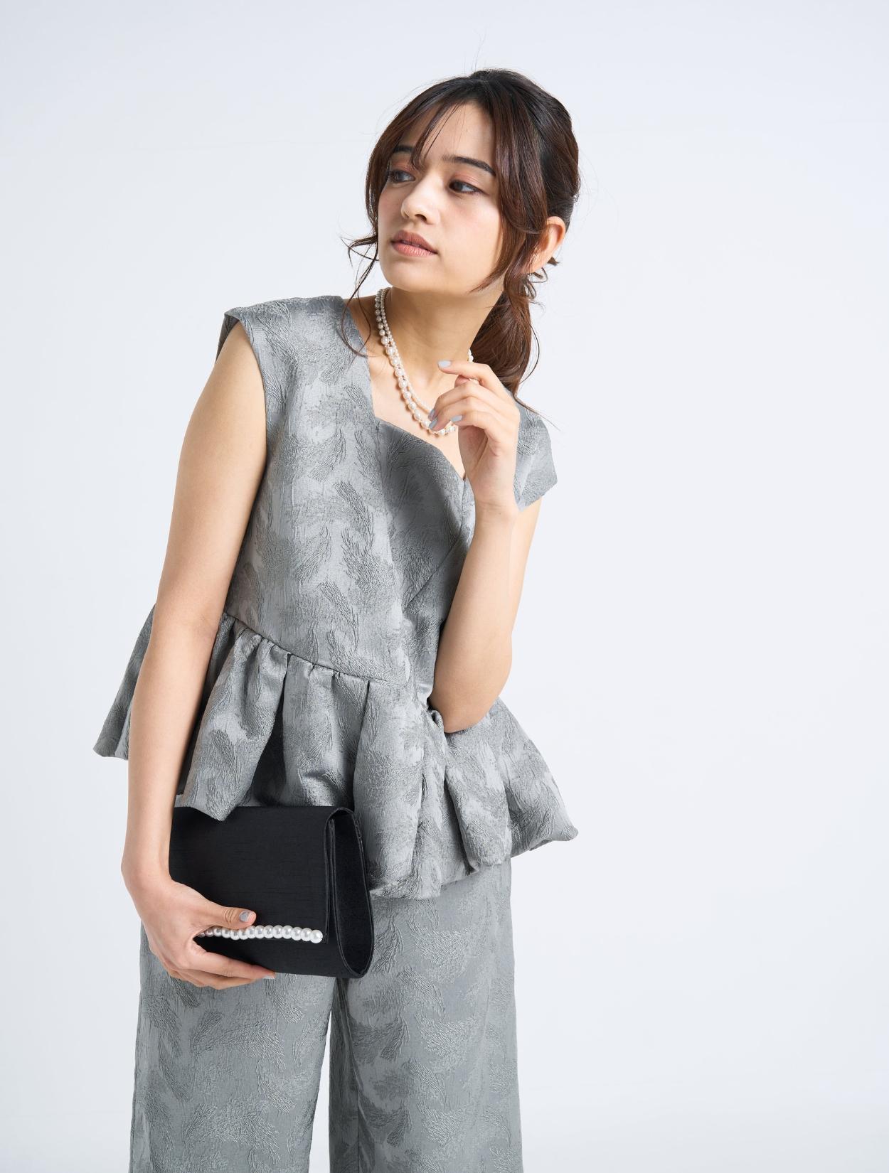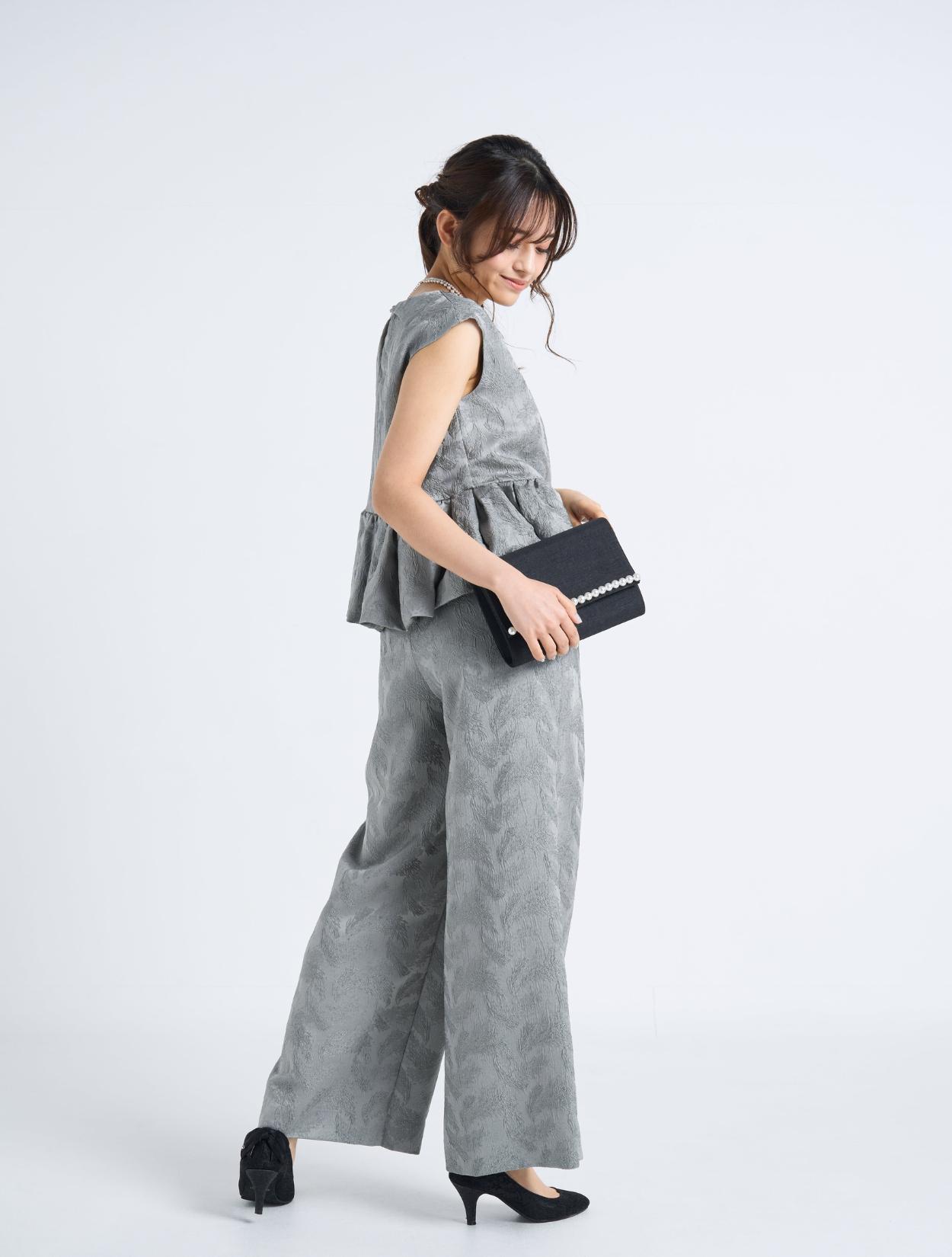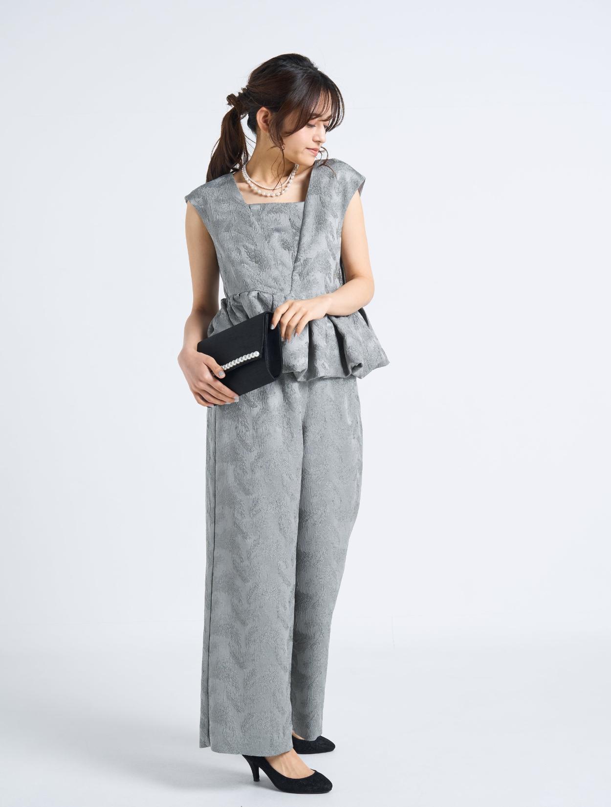 ■光沢感のあるグレーのジャガードが華やかなセットアップパンツドレスです。