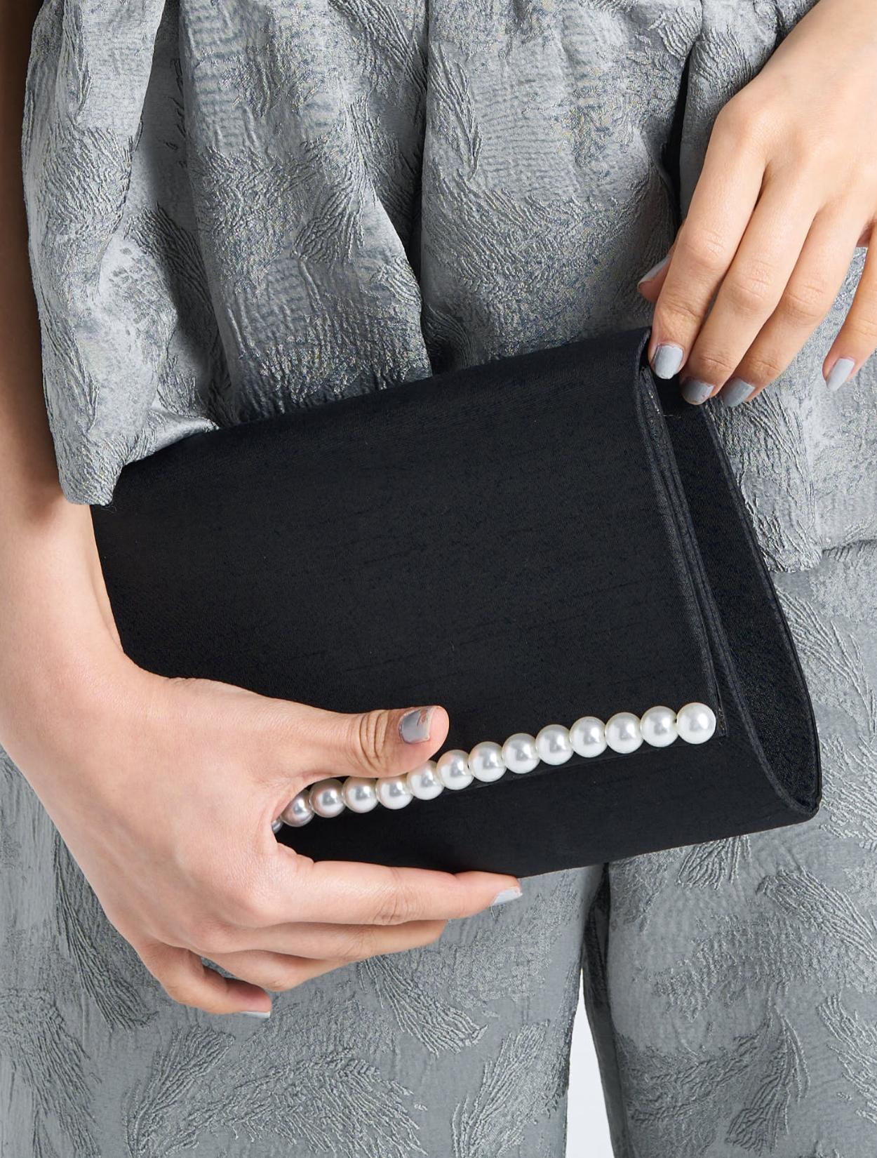 ■パールを基調としたブラックのバッグで締まった印象に。