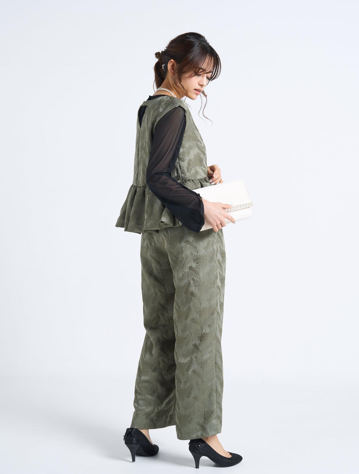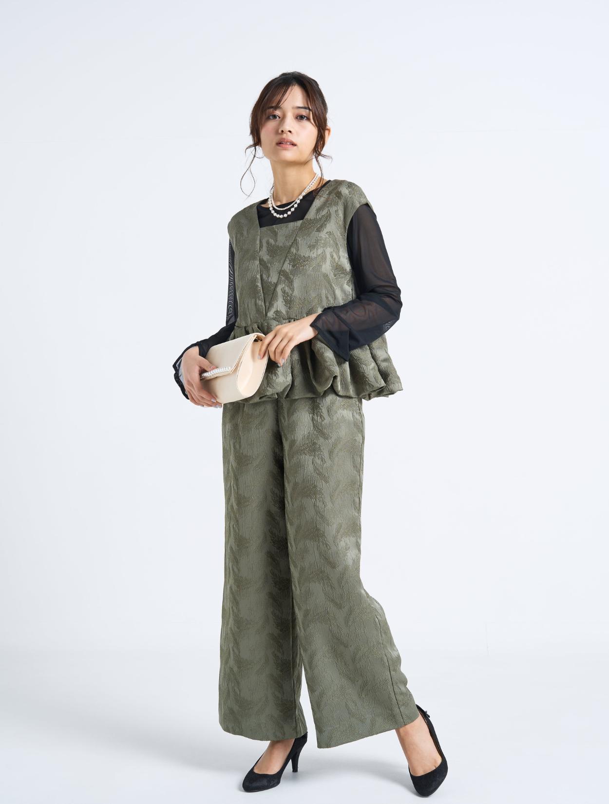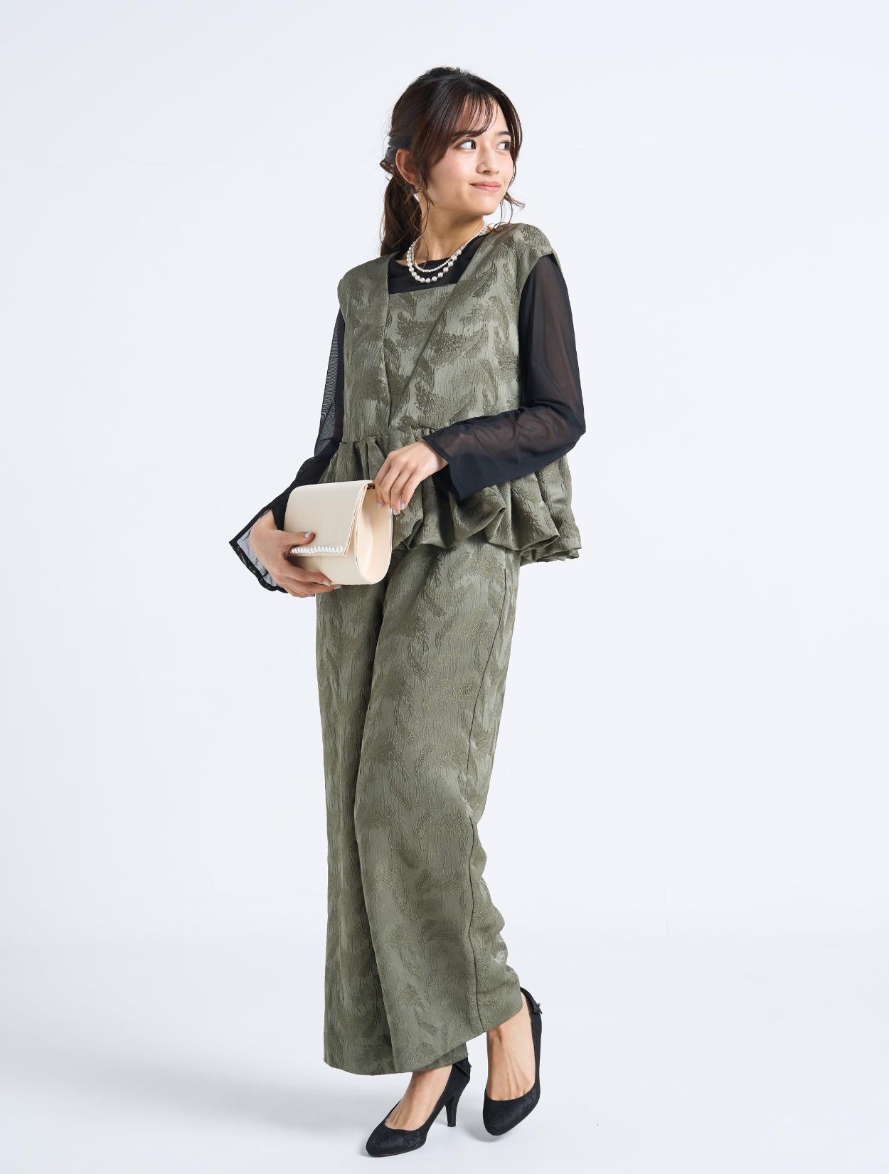 ■穏やかでファッショナブルなカーキ色のドレスにブラックのシアーブラウスを合わせたトレンド感のあるコーディネート。