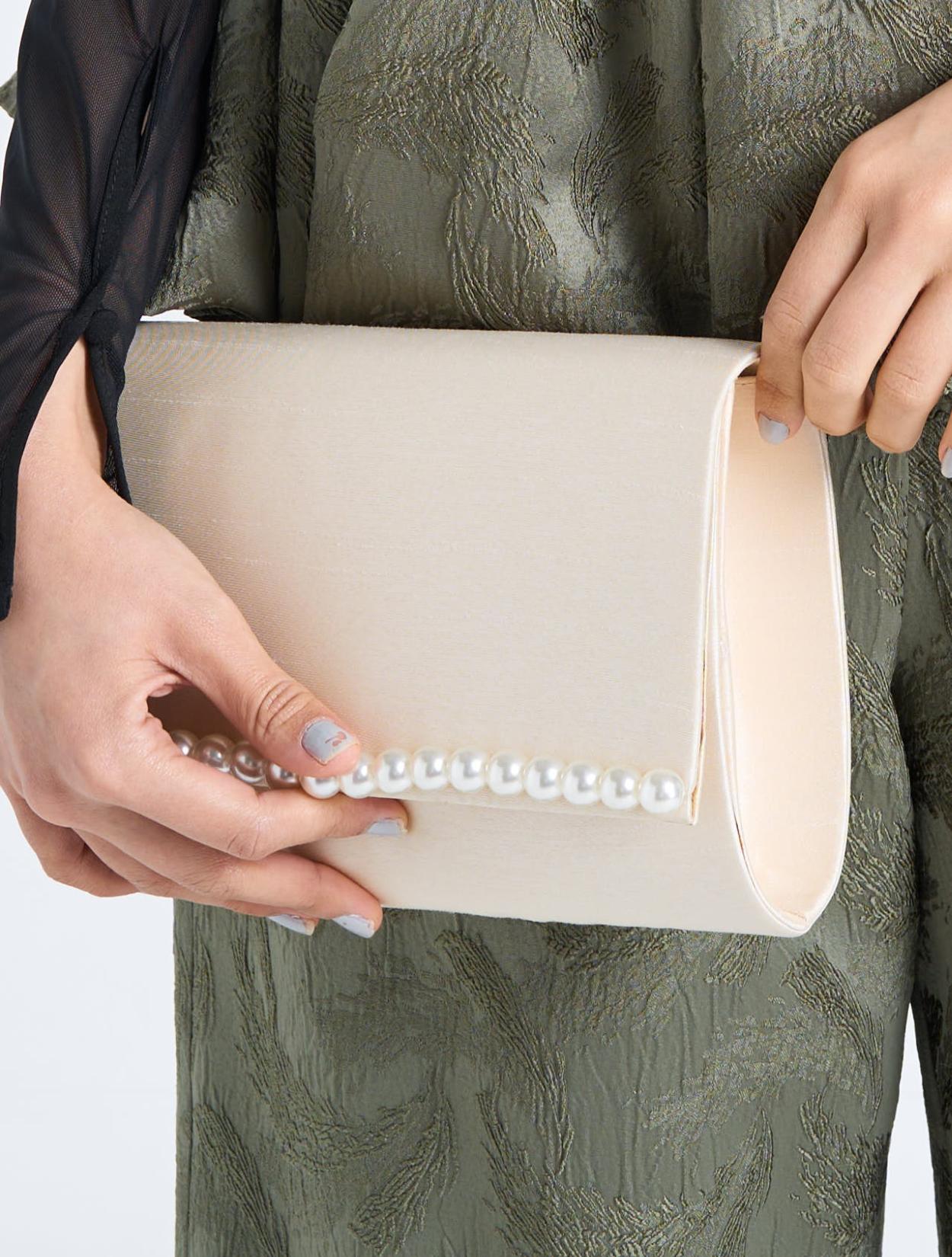 ■パールを基調とした優し気なベージュのバッグで女性らしさをプラス。