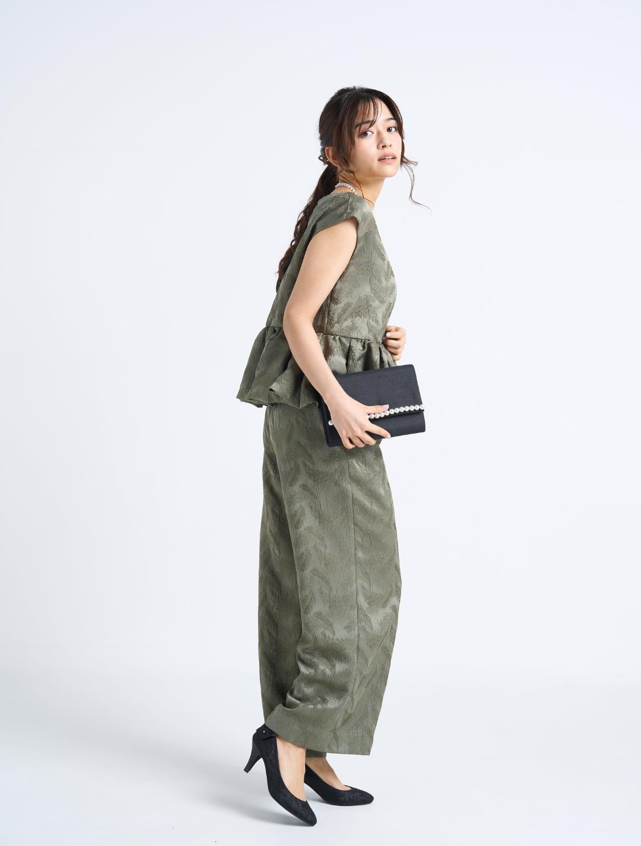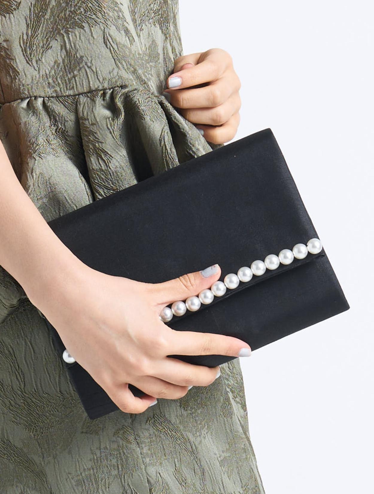 ■パールを基調としたブラックのバッグで締まった印象に。