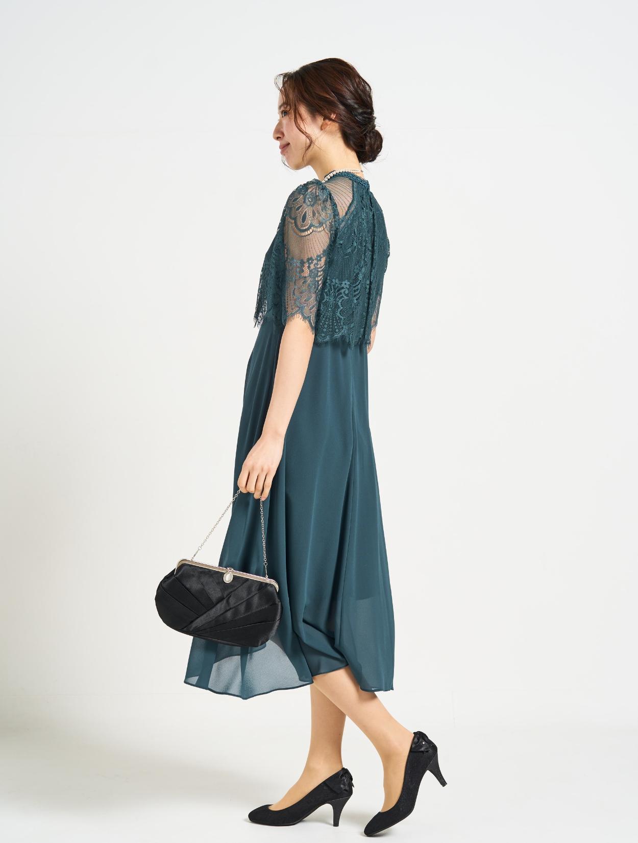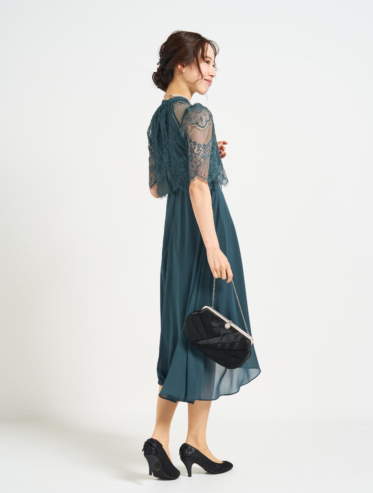 ■鮮やかなグリーンのドレスにブラックのバックを合わせた落ち着きのあるコーディネート。