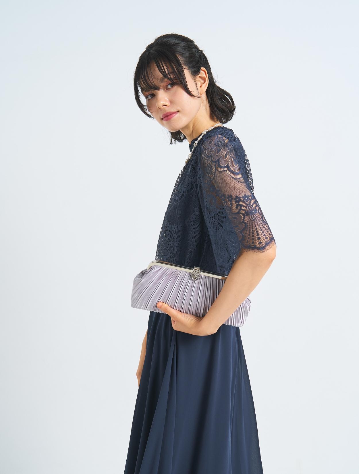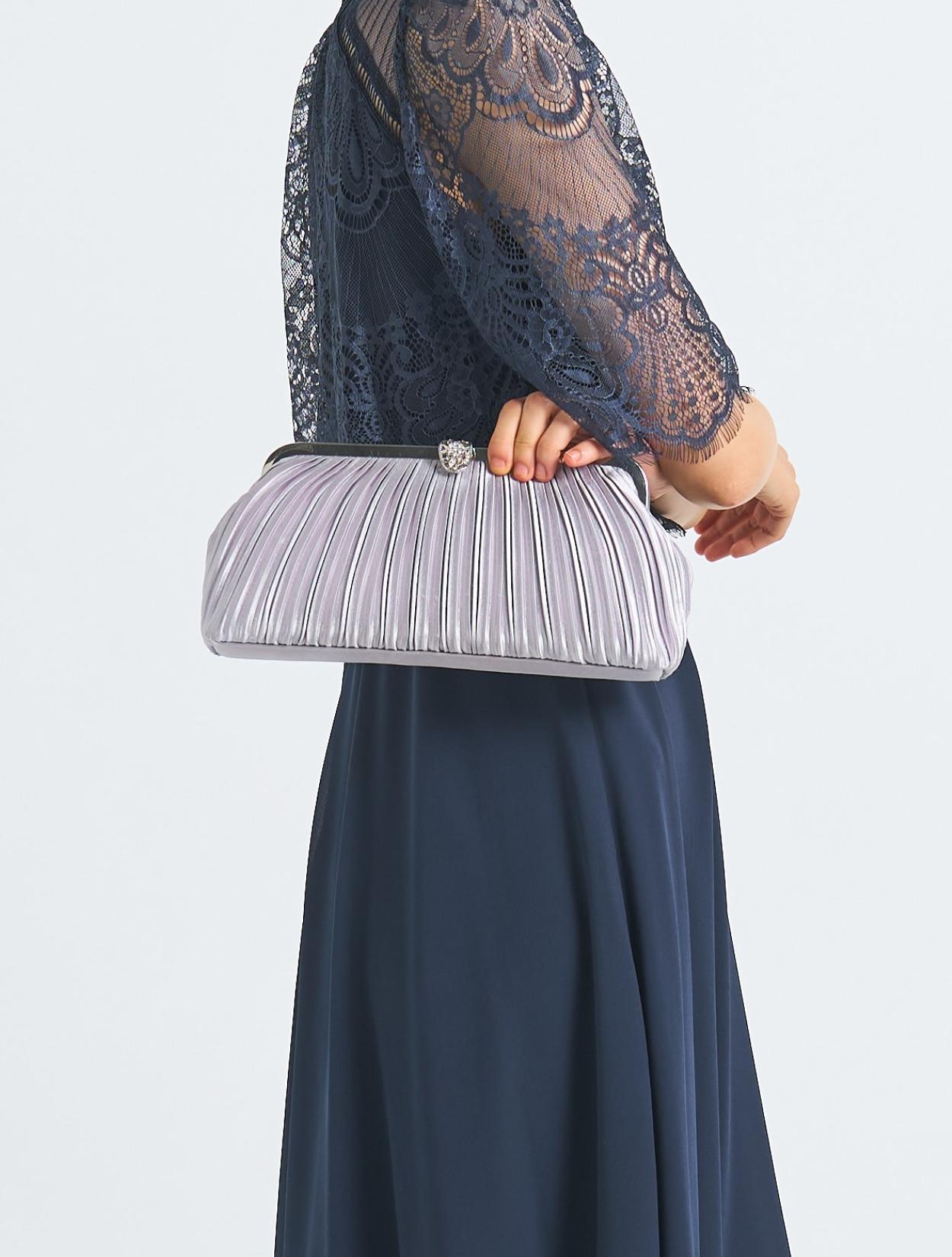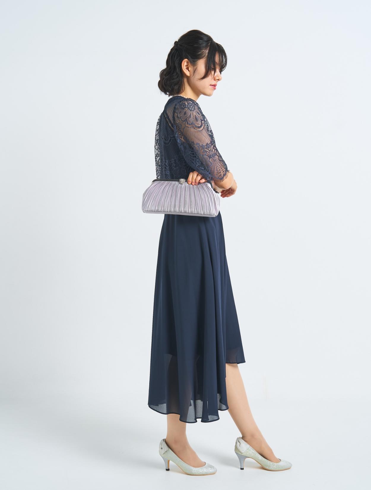■ネイビーのドレスにシルバーグレーのバッグを合わせたクラシックなコーディネート。