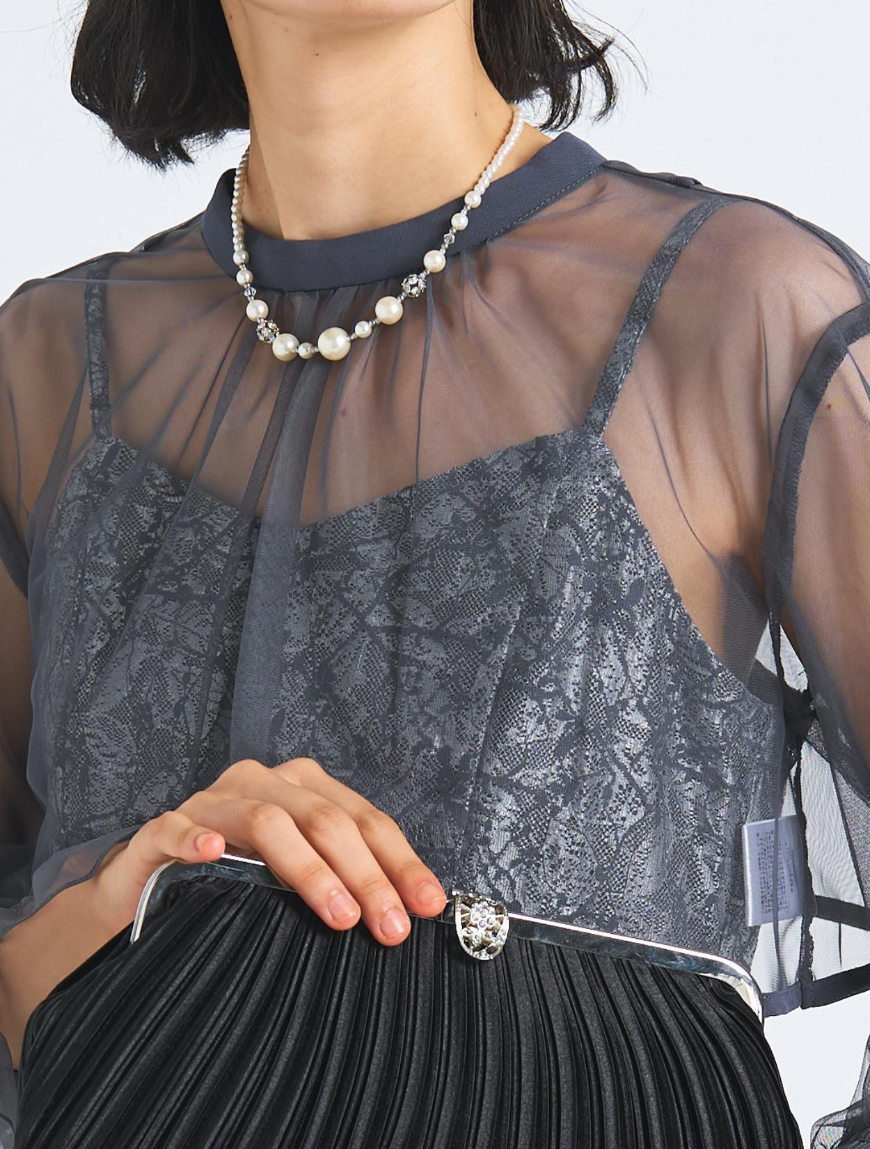 ■首元のキラッとしたネックレスがコーディネートにメリハリをプラス。