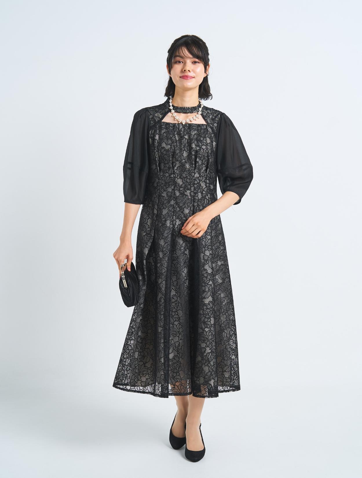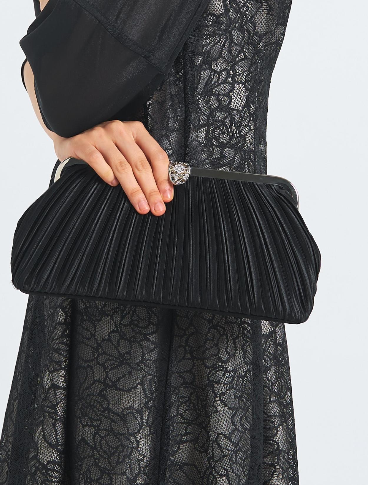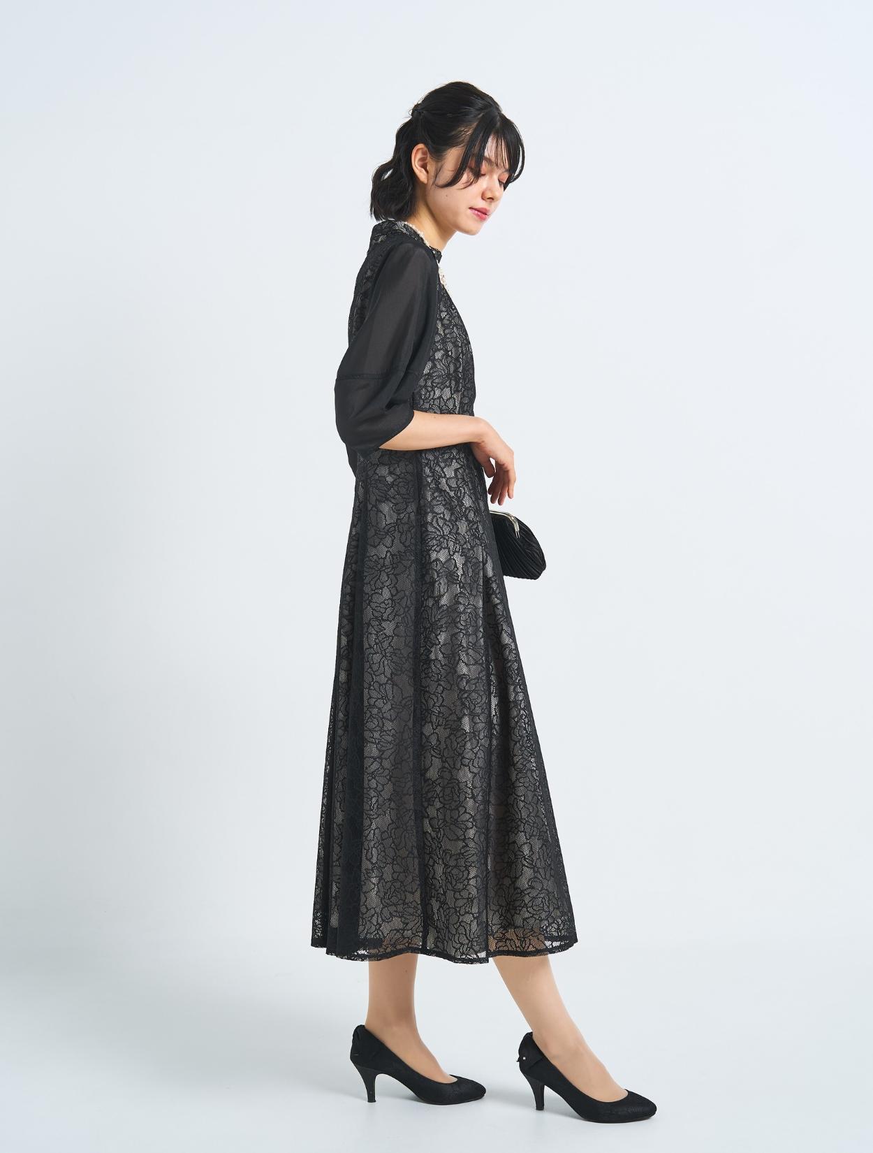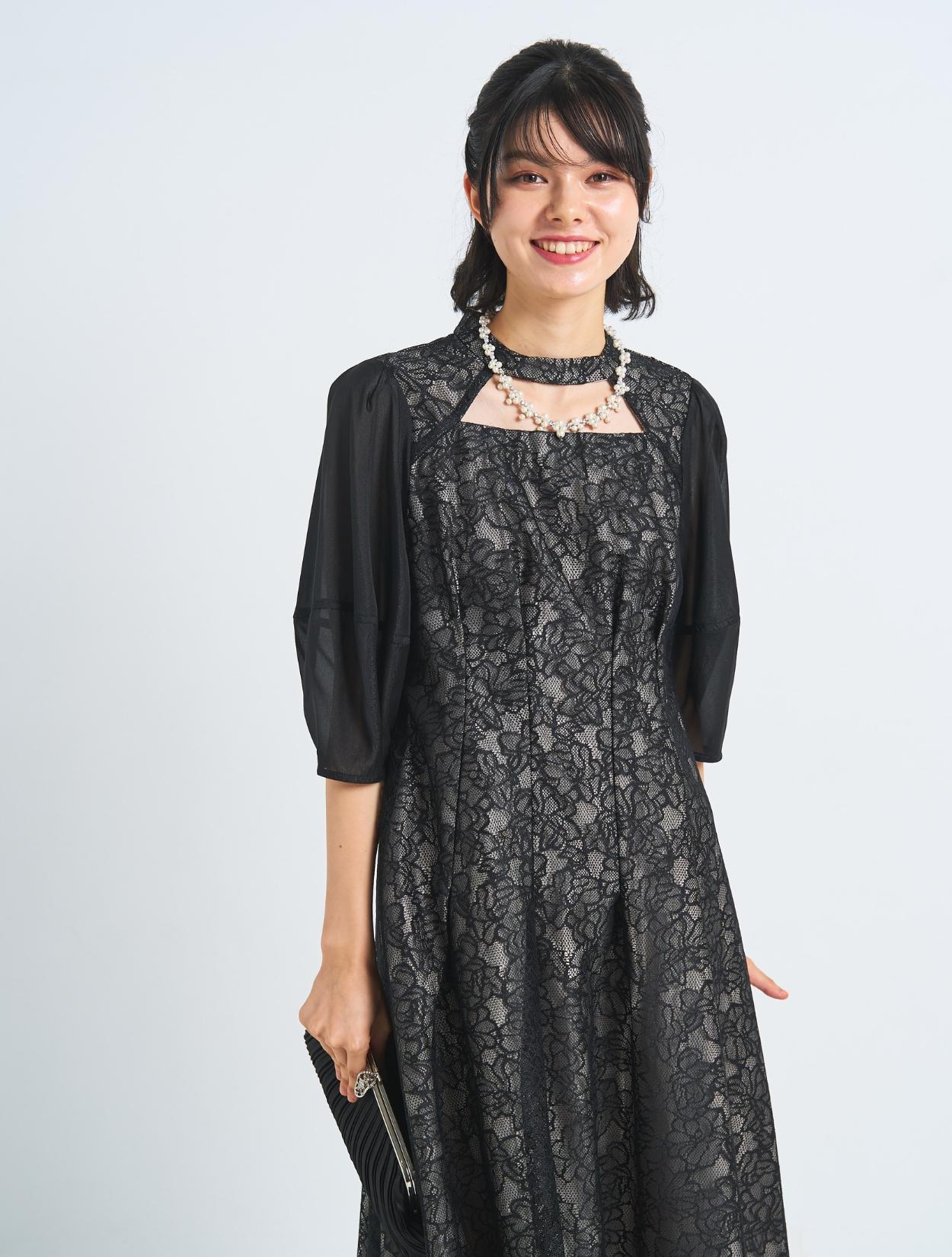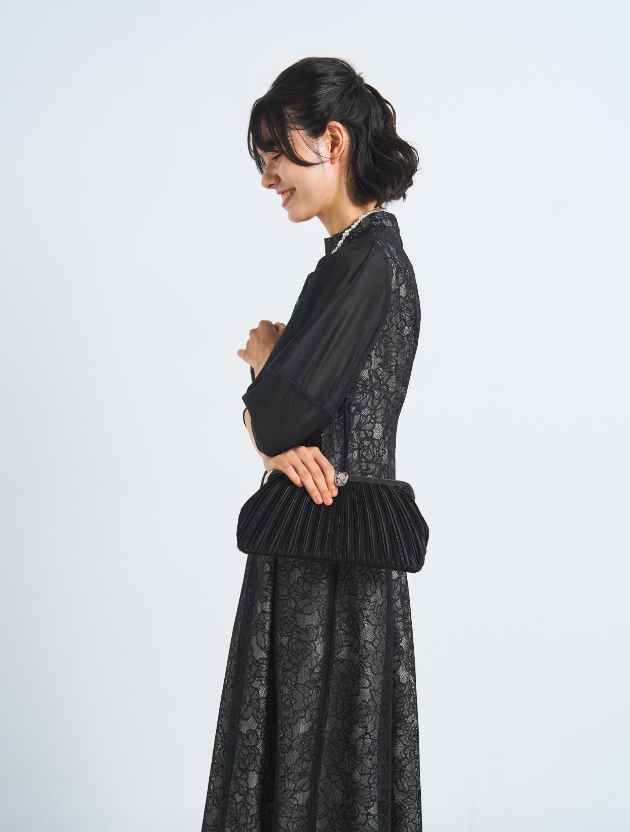 ■オールブラックでも、ドレスやバッグのディティールで華やかさもあるコーディネート