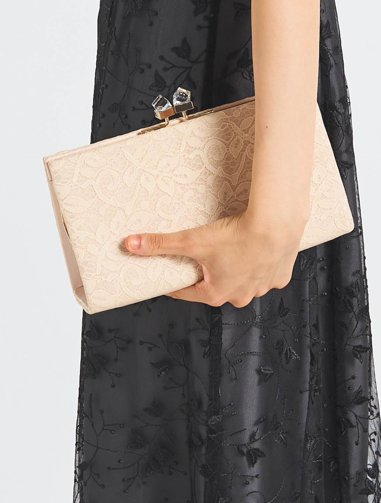 ■ブラックドレスにベージュのバッグを合わせて華やかさをプラスしたコーディネート